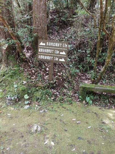 丸野駐車場からゆっくり歩いて45分、目的地である「広河原休憩所」に到着。シイやタブ等の照葉樹林があり、深呼吸。癒やされます。