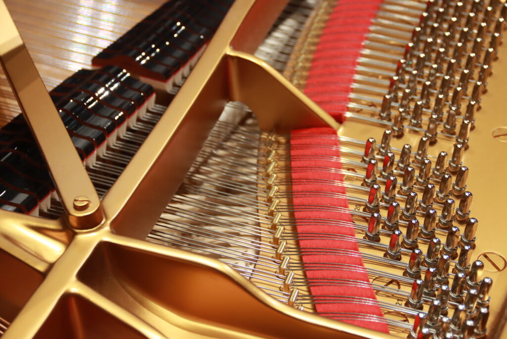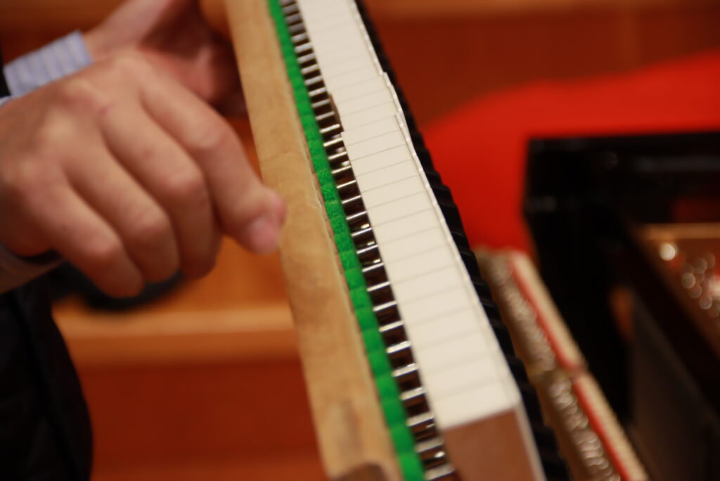片野)鍵盤の裏にフェルトがあって、それがピンをこすりながら降りてくるんですね。新しいと肉厚だから抵抗が大きくて、その抵抗が重さに感じることがあります。物理的には重くないんだけれど、抵抗があるから重い。なので、ピンを磨くなり、スルスルにすれば抵抗がなくなったら軽くなったって。実際には、コンサートの当日は、ピンを磨くことはよくやりますね。そうすると擦った時の抵抗がなくなって、それが軽さにつながる。物理的な重さの調整は、今回のオーバーホールの時のように、工場でないと変えられないので……。それが今回のオーバーホールで変わって、軽くなっています。05は重かった、あれも軽くなった。