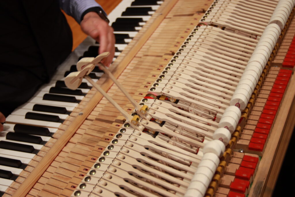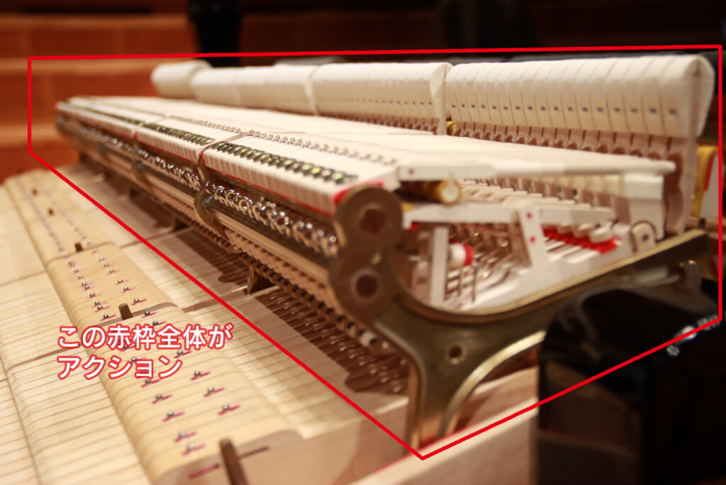 片野)一緒ですね、基本。多少違いが時代によってはあったんだけれど、このシステムが一番機能的だってことで、ほぼどこのメーカーもこのシステムを採用しています。ダブルエスケープメントっていう、力がダブルで逃げていく(上述の脱芯のこと)。だから、現代のピアノは調整が大変。鍵盤のひとつひとつのアクションの中に15工程ぐらいの調整があって、保守点検の時にそういう調整をやっています。鍵盤の高さや深さもあるんだけれど、8割方ここの調整なんです。複雑になった分、調整をちゃんとやらないと、そのシステムはうまく機能しない。全ての調整がうまくいってはじめて機能するという複雑なシステムになっています。