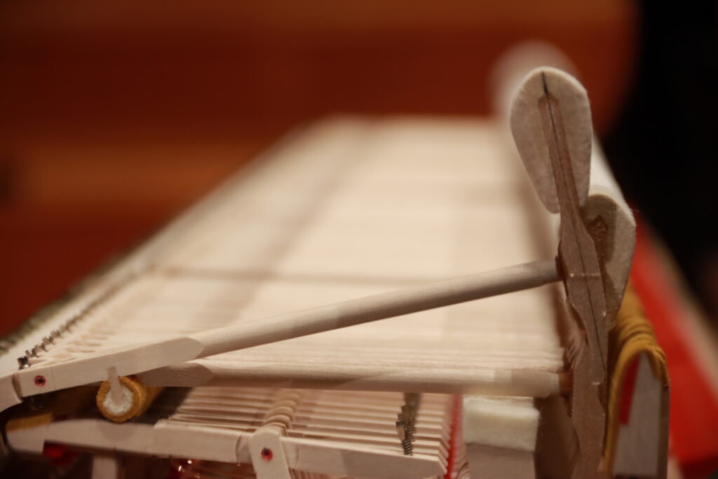 片野)そして逃げた軸が、鍵盤から指を離すと元の位置に戻っていく。このシステムにたどり着くのに100年以上かかっています。昔のピアノは、現代ピアノと奏法が違うんですよね。今みたいにピアニストがガーンと押し付けたら、弦を押さえつけてしまうから、常に手をぱっと離すという奏法になります、そうしないと演奏ができないので。ピアノが奏法に影響を与えるし、奏法からピアノが改良される。そういう相互の作用があって100年以上経って、現代のピアノに近づきました。1719年に最初にできて、1820年ぐらいのものもまだ現代ピアノとは違って、ベートーヴェンの頃のピアノ。1850年代以降ぐらいから現代のピアノのシステムに近づいてきて…。