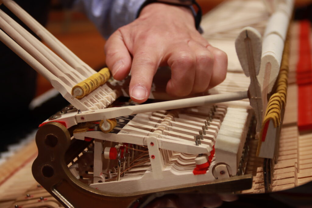 片野)たとえば、ハンマーにフェルトっていう羊毛でできたものが使われるようになったのも1800年代。その前は鹿皮で、木に鹿の皮を貼った感じ。フェルトにしたことで、いろんな音色を出せるようになったけれど、ただのフェルトだと柔らかくて鳴らない。それを固めて圧縮する技術とか、産業革命の影響を受けていますよね。ピアノは手作りってイメージがあるけど、産業革命の影響が必ずあって、機械工作のおかげで人間にはできないことができるようになったのが大きい。弦にしても、硬い鋼線を、ずーっと細く伸ばしていくことは人間にはとてもできない。産業革命の機械と人間の技術が融合したものがピアノ。ちなみに、チェンバロは人間だけでつくっていました。チェンバロは弦をひっかける、というつくりなので。