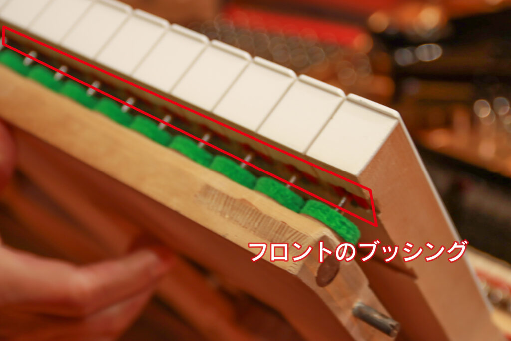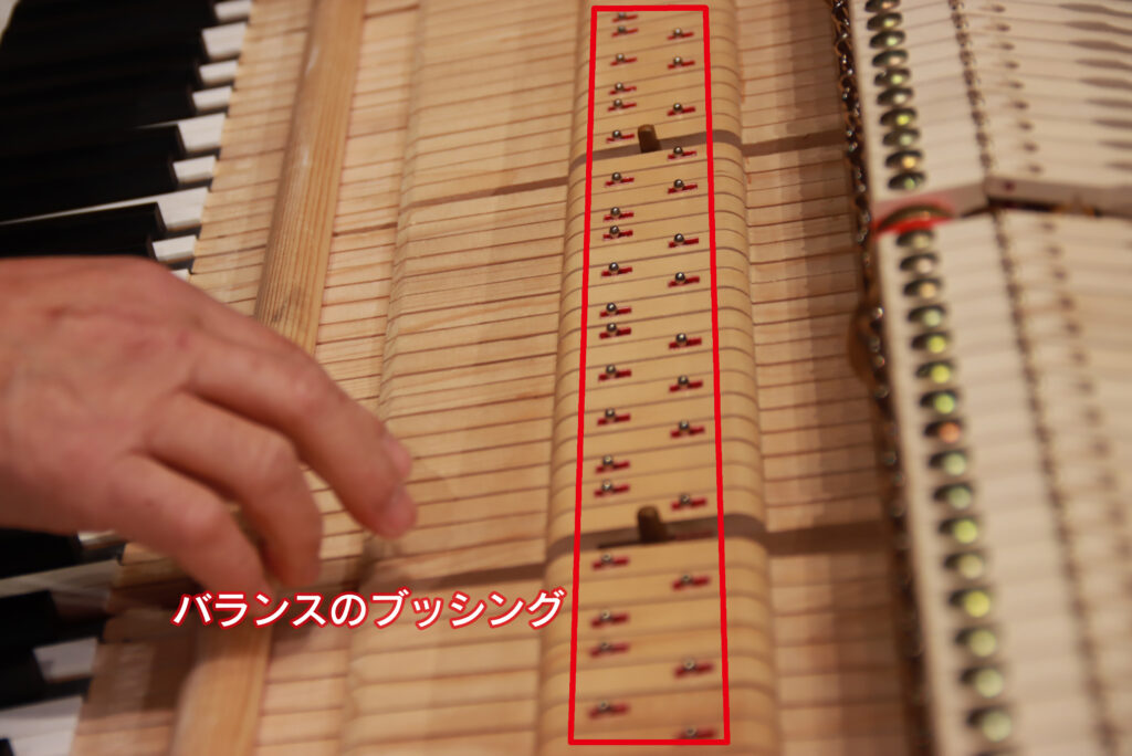片野)まずブッシングというフェルトの部分がすり切れていたので、替わっています。鍵盤の下にあるフロントのブッシング、鍵盤を叩くとハンマーがあがってシーソーみたいに弦を叩くんですが、その支点となっているバランスのブッシング。木と金属のピンが摩擦すると雑音が生じるので、緩衝材としてフェルトのブッシングが貼られています。これが摩耗して劣化すると、ガタがでてくるので、何十年か一度に替えるんですけど、このピアノは今回で初めて替えましたね。
