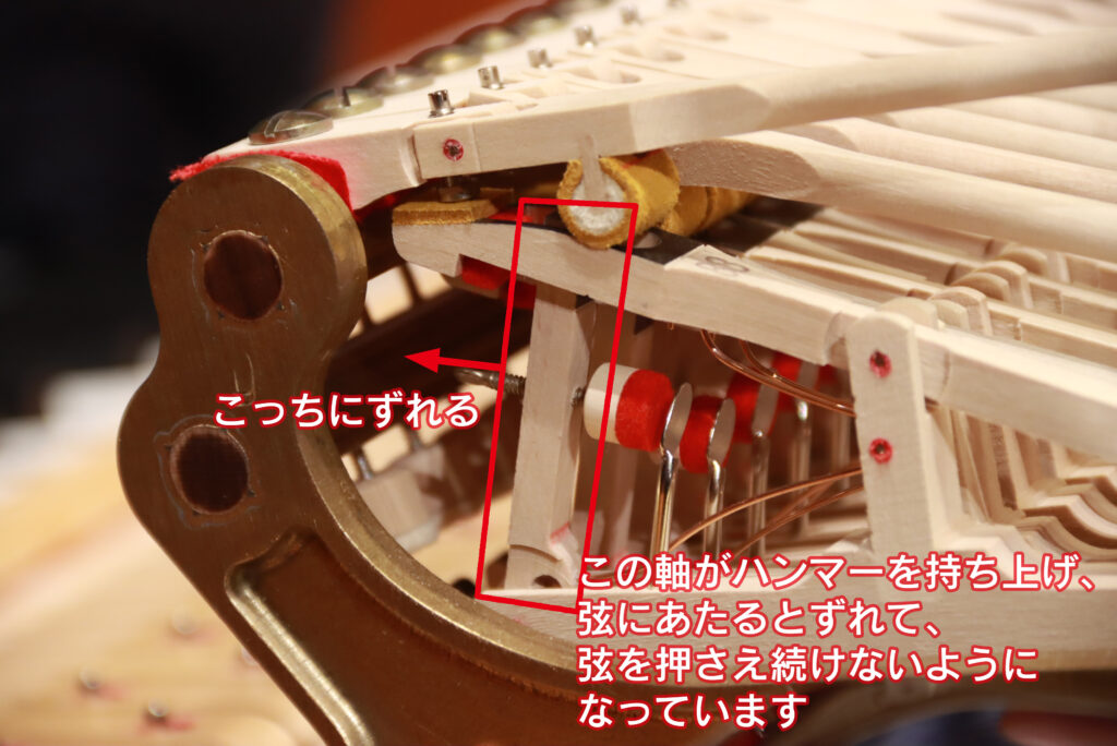 片野)このシステムにたどり着いたのが、現代ピアノ。昔のピアノは、鍵盤を叩くとハンマーをあげる軸があって、それがハンマーを持ち上げて弦を押すという仕組みでした。それだと、押し続けたらとまっちゃいますよね(弦を押さえつけることになるため)。それを、実際には軸が動いているんだけれど、当たる瞬間に脱芯っていうんだけれど、力が抜けるようになっています。この軸が逃げるでしょ。