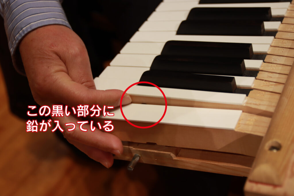 片野)鉛が鍵盤のいたる所に入っています。その鉛が、シーソーの要領で、アクションの部分とバランスをとるようになっている。そのバランスが、重さ・軽さになります。バランスをとるために、はたして何gの重さが必要なのか、それは1鍵ずつ違う。全部鉛の大きさや入っている位置が違うんです。鉛の位置を支点から遠ざければ遠ざけるほど軽くなるし、微調整する時は小さなものを支点に近いところに入れたり。そういうことをしてバランスをとるんだけれど、それで総重量が重くなったり、軽くなったりするのも良くない。全部が100kgあるシーソーを動かすのと、10kgあるシーソーを動かすのは、力の加減が変わってきますよね。重くなりすぎたら、動きがにぶくなって、軽くても今度は鍵の戻りが遅くなる。戻りがすごく重要なので早くしようとすると、今度は重くなってくる。そういうバランスをいろいろ調整していきます。
