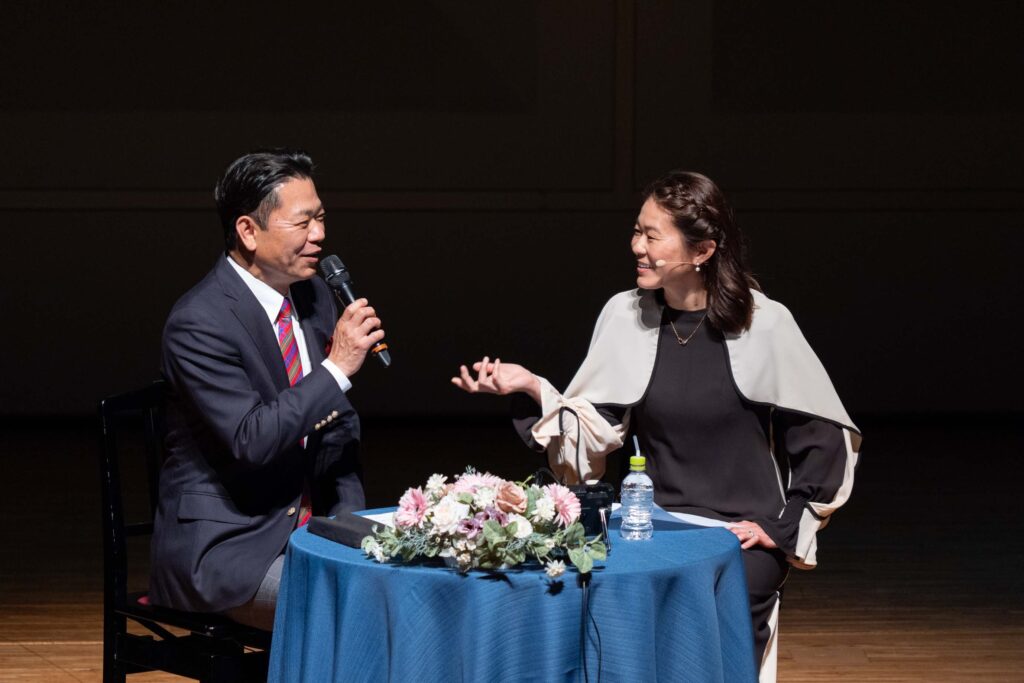 幼い頃、男の子に混じってサッカーを始め、15歳で女子サッカーの日本代表に選ばれたこと、アメリカのチームに所属して技術や強い当たりを磨いた時代。幾つかのオリンピックを経て次第に強くなっていった日本代表、世界一になった2011年のサッカーW杯、引退後の私生活を含めた現在までを、エピソードを交えて語ってくださいました。司会はMRTの川野武文アナウンサー、時には漫才のような楽しく活発なやりとりが続きました。