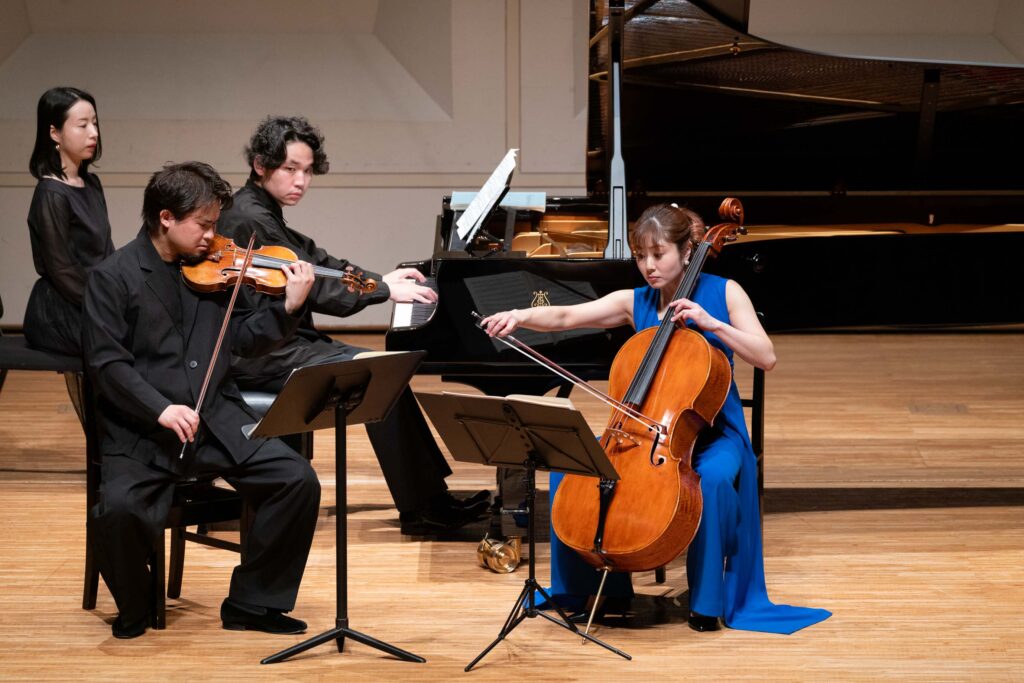 第一部は、まずベートーヴェンのピアノ三重奏曲のためのアレグレットの演奏。続いて、それぞれの楽器の仕組みや裏話、そして第二部で演奏するメンデルスゾーンのピアノ三重奏曲第1番についての興味深い話が披露されました。メンデルスゾーンの曲の4つの楽章のそれぞれの特徴、どのようなテンポや想いで演奏しているかというお話、「ここは自分が目立つ!際立つ!」と思って弾いている箇所など、聞いたことがない話が次々に出てきます。