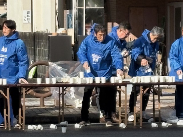 私たちはというと、後ろのメンバーが紙コップに水を次々に入れ、そのコップを前の担当が道路脇のテーブルに次々に並べていきます。ランナーが取りやすいよう、コースに近いテーブルの端に適当な間隔を空けて、コップを置いていかなければなりません。勢いよく走ってくるランナーは、コップを取る際に隣のコップまで倒すことも。