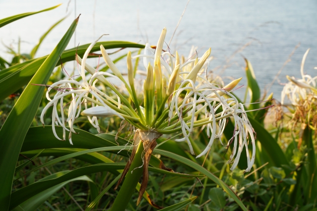 ハマユウ、漢字では浜木綿。ヒガンバナ科の植物で、初夏から夏にかけて、白い花が海辺などを彩ります。雨や風に耐えて白い花を咲かせ、種を海に託し波に運ばれて命をつなぐ姿から、その花言葉は「希望」「汚れのない」「どこか遠くへ」「あなたを信じます」など。