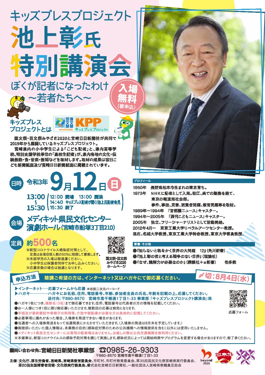 国民文化祭 キッズプレスプロジェクト 池上彰氏特別講演 「ぼくが記者になったわけ~若者たちへ~」 その他 料金 お問い合わせ先 2021年09月12日(日) 演劇ホール 開場 12:00/開演 13:00/終演予定 15:30 料金 オンライン配信(講演会参加希望者へ個別に案内) ※詳細は、公式サイトをご確認下さい。 お問い合わせ先 [お問い合わせ先] 宮崎日日新聞社イベント事業局事業部 0985-26-9303