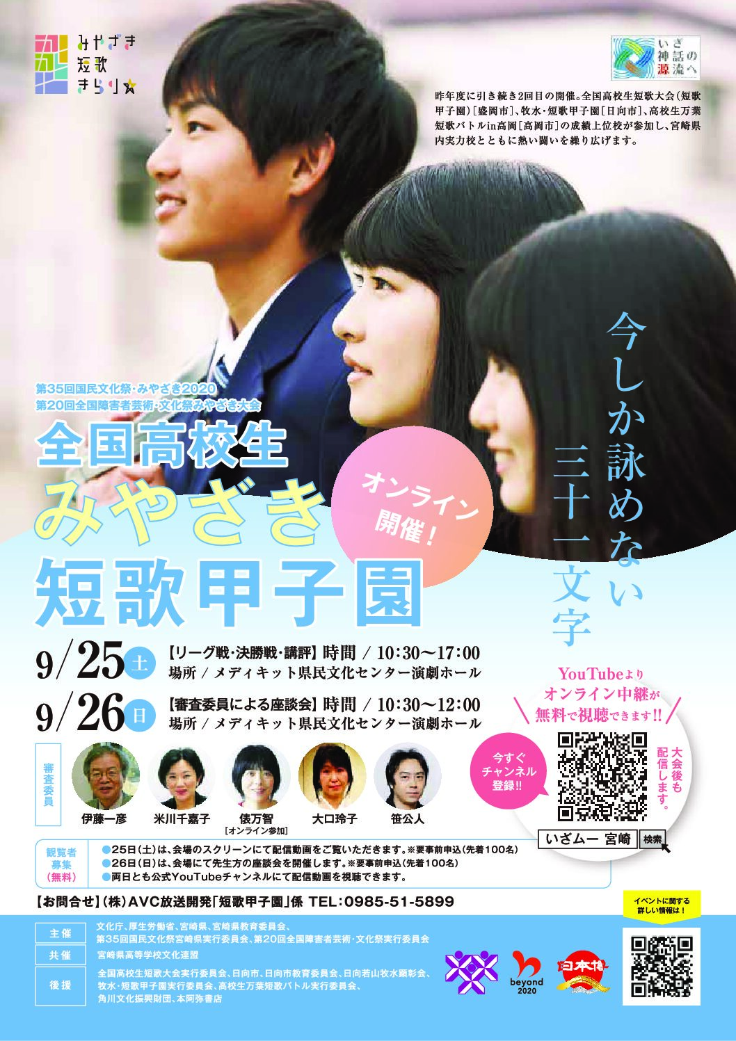 国民文化祭 みやざき短歌きらり★ 全国高校生みやざき短歌甲子園 その他 チラシダウンロード 料金 お問い合わせ先 2021年09月25日(土) 演劇ホール 【オンライン配信のみ】 開場 10:00/開始 10:30/終了予定 17:00 <リーグ戦・決勝戦・講評> YouTubeチャンネルいざムーいざ!国文祭・芸文祭みやざきムービー隊(外部サイトへリンク) 料金 無料 お問い合わせ先 [お問い合わせ先] 第35回 国民文化祭宮崎県実行委員会 第20回 全国障害者・芸術文化祭実行委員会 0985-26-7413