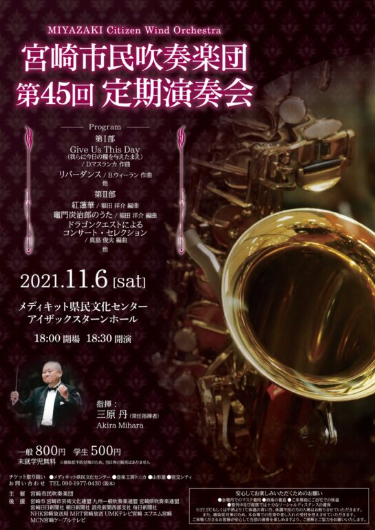 宮崎市民吹奏楽団 第45回定期演奏会 音楽 チケット料金 主催・お問い合わせ先 2021年11月06日(土) アイザックスターンホール 開場 18:00/開演 18:30/終演予定 20:50 駐車場の混雑が予想されます チケット料金 一般 800円 学生 500円 * 感染症予防対策のため、当日券の販売はありません 主催・お問い合わせ先 宮崎市民吹奏楽団 阪本 090-1977-0430