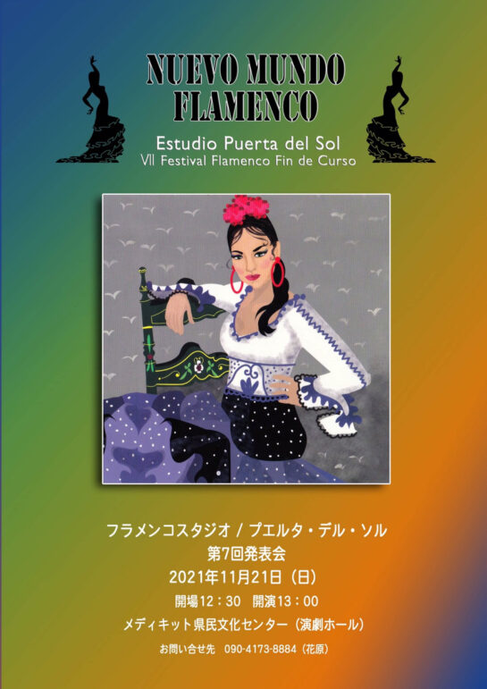 プエルタ・デル・ソル 第7回フラメンコ発表会 演劇・ダンス チラシダウンロード チケット料金 主催・お問い合わせ先 2021年11月21日(日) 演劇ホール 開場 12:30/開演 13:00/終演予定 15:15 駐車場の混雑が予想されます チケット料金 2,000円 主催・お問い合わせ先 花原 090-4173-8884