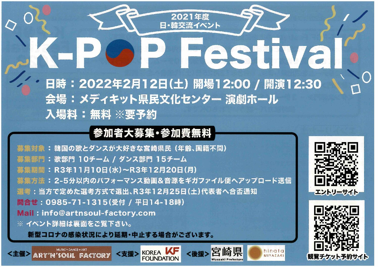 K-POP Festival 演劇・ダンス チラシダウンロード 料金 お問い合わせ先 2022年02月12日(土) 演劇 ホール 開場 12:00/開演 12:30/終演予定 16:00 料金 無料 * 公演開催状況につきましては、 「お問い合わせ先」 へご確認ください。 お問い合わせ先 アートン ソウル ファクトリー 0985-71-1315