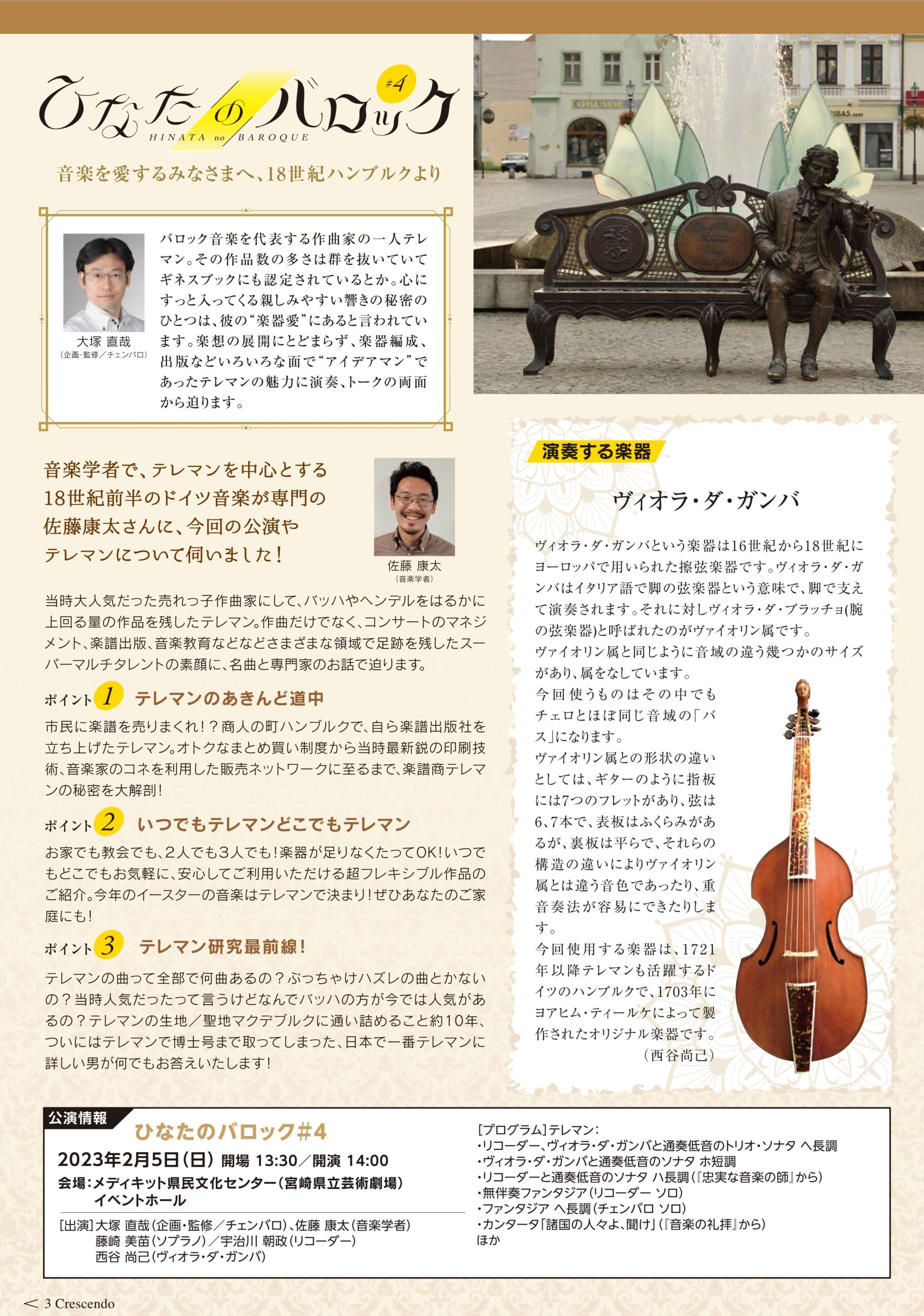 バロック音楽を代表する作曲家の一人テレマン。その作品数の多さは群を抜いていてギネスブックにも認定されているとか。心にすっと入ってくる親しみやすい響きの秘密のひとつは、彼の“楽器愛”にあると言われています。楽想の展開にとどまらず、楽器編成、出版などいろいろな面で“アイデアマン”であったテレマンの魅力に演奏、トークの両面から迫ります。