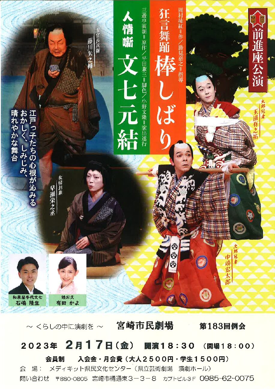 前進座「人情噺 文七元結・棒しばり」 演劇・ダンス チラシダウンロード チケット料金 お問い合わせ先 2023年02月17日(金) 演劇ホール 開場 18:00/開演 18:30/終演予定 21:00 駐車場の混雑が予想されます チケット料金 指定席・会員制 * 新規入会につきましては「お問い合わせ先」へご確認ください。 * 未就学児のご入場はご遠慮ください。 お問い合わせ先 [お問い合わせ先] 宮崎市民劇場 0985-62-0075