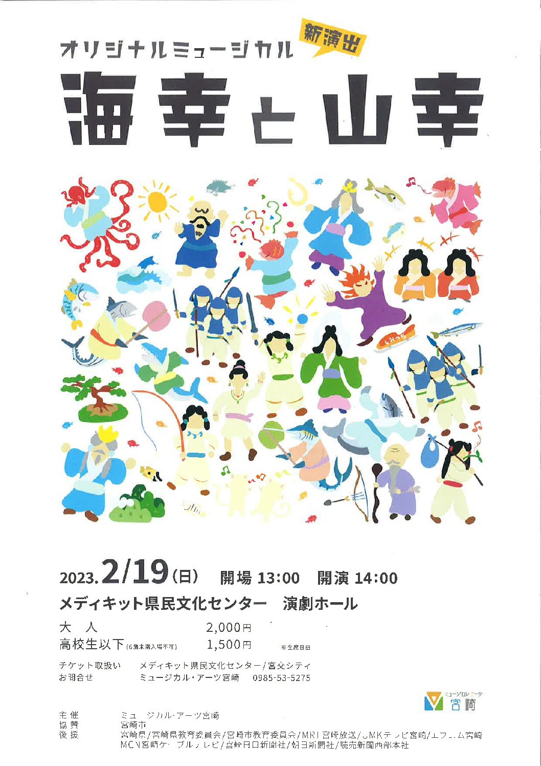 オリジナルミュージカル「海幸と山幸」 演劇・ダンス チラシダウンロード チケット料金 チケット予約 お問い合わせ先 2023年02月19日(日) 演劇ホール 開場 13:00/開演 14:00/終演予定 16:10 駐車場の混雑が予想されます 公演の詳細につきましては、公式サイトをご確認ください。 チケット料金 <全席自由> 大 人:2,000円 高校生以下:1,500円 * 6歳未満入場不可 チケット予約 メディキット県民文化センターチケットセンター 午前10時~午後6時30分/月曜休館(月曜が祝日の場合は翌平日休館) ※くれっしぇんど倶楽部会員割引は適用外となります。 ※窓口でのみの販売となっており、電話での予約はできません。 ※チケットセンターでの販売は、公演の前日までとなります。 ※その他のプレイガイドは、公式サイト・チラシよりご確認ください。 お問い合わせ先 [お問い合わせ先] ミュージカル・アーツ宮崎 0985-53-5275
