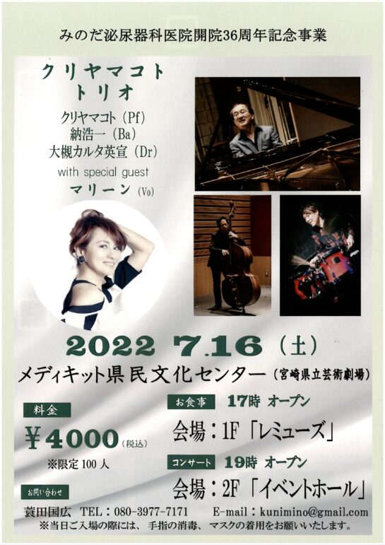 みのだ泌尿器科医院開院36周年記念事業「クリヤマコト トリオ with マリーン」