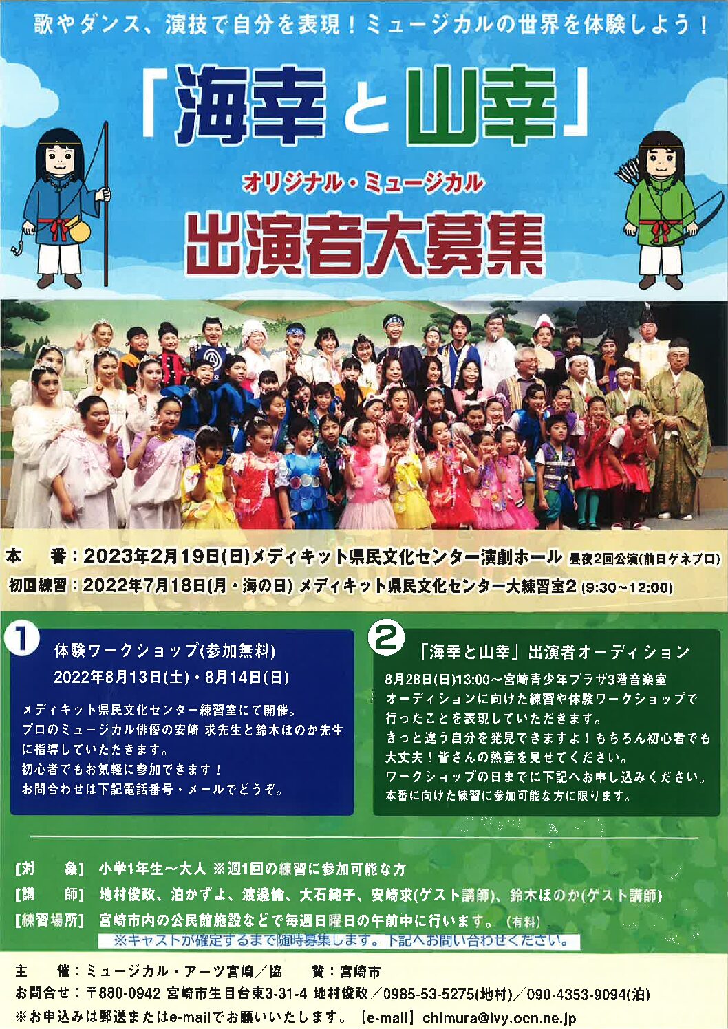オリジナルミュージカル「海幸と山幸」体験ワークショップ 演劇・ダンス チラシダウンロード 参加料 主催・お問い合わせ先 2022年08月13日(土) 大練習室1・2 9:30~11:45、18:30~21:45 駐車場の混雑が予想されます 参加料 無料 * 未就学児のご入場はご遠慮ください。 主催・お問い合わせ先 ミュージカル・アーツ宮崎(地村) 0985-53-5275 ミュージカル・アーツ宮崎(泊) 090-4353-9094 メール chimura@ivy.ocn.ne.jp