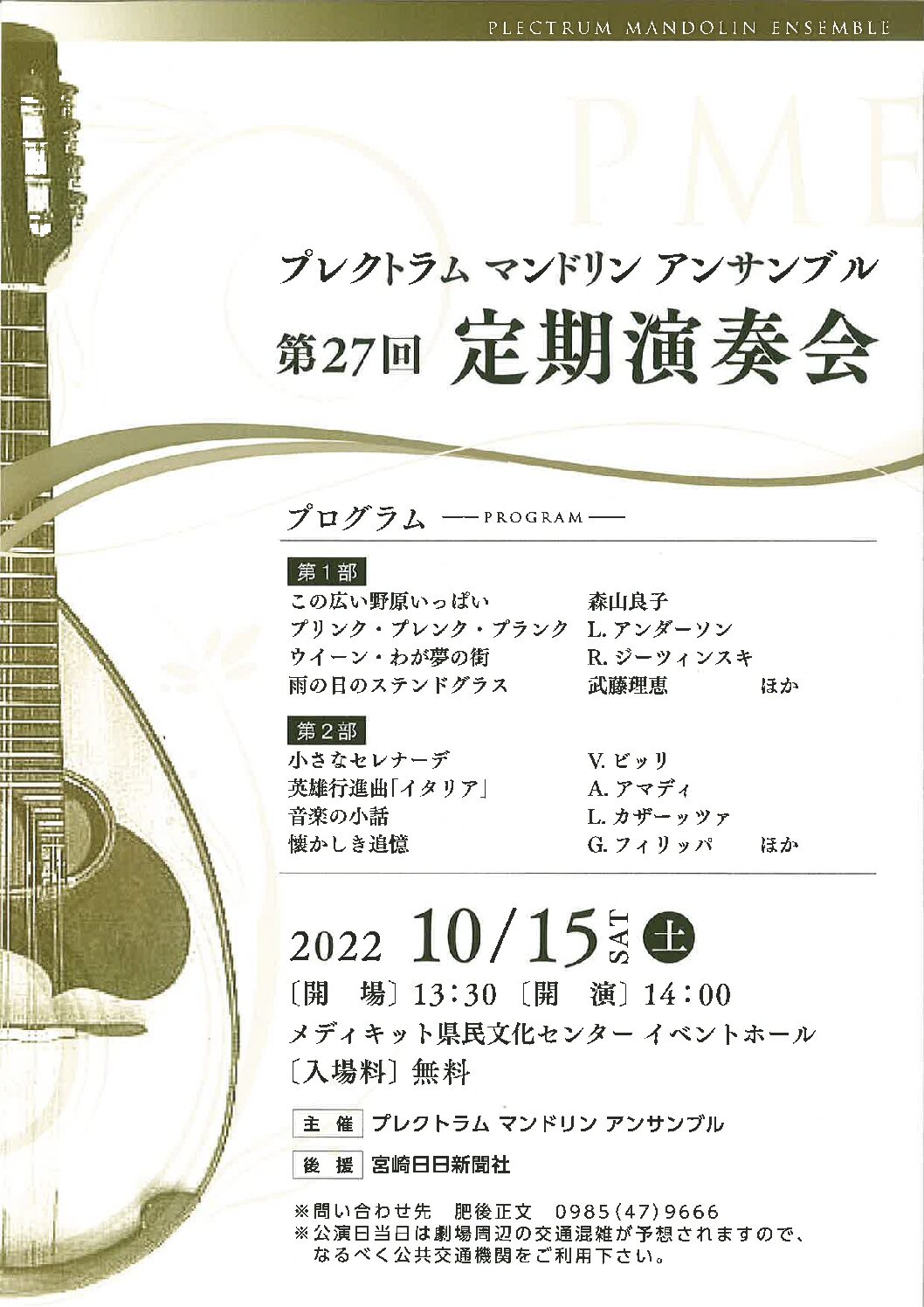 プレクトラムマンドリンアンサンブル 第27回 定期演奏会 音楽 チラシダウンロード 入場料 お問い合わせ先 2022年10月15日(土) イベントホール 開場 13:30/開演 14:00/終演予定 16:30 入場料 無料 お問い合わせ先 プレクトラムマンドリンアンサンブル 肥後 0985-47-9666