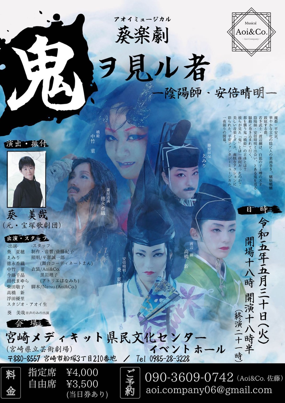 葵楽劇アオイミュージカル『鬼ヲ見ル者-陰陽師・安陪晴明-』 演劇・ダンス チラシダウンロード チケット料金 お問い合わせ先 2023年05月30日(火) イベントホール 開場 18:00/開演 18:30/終演予定 21:00 公演の詳細につきましては、公式サイトをご確認ください。 チケット料金 指定席:4,000円 自由席:3,500円 * 当日券あり お問い合わせ先 スタジオ・アオイ 0985-28-5500
