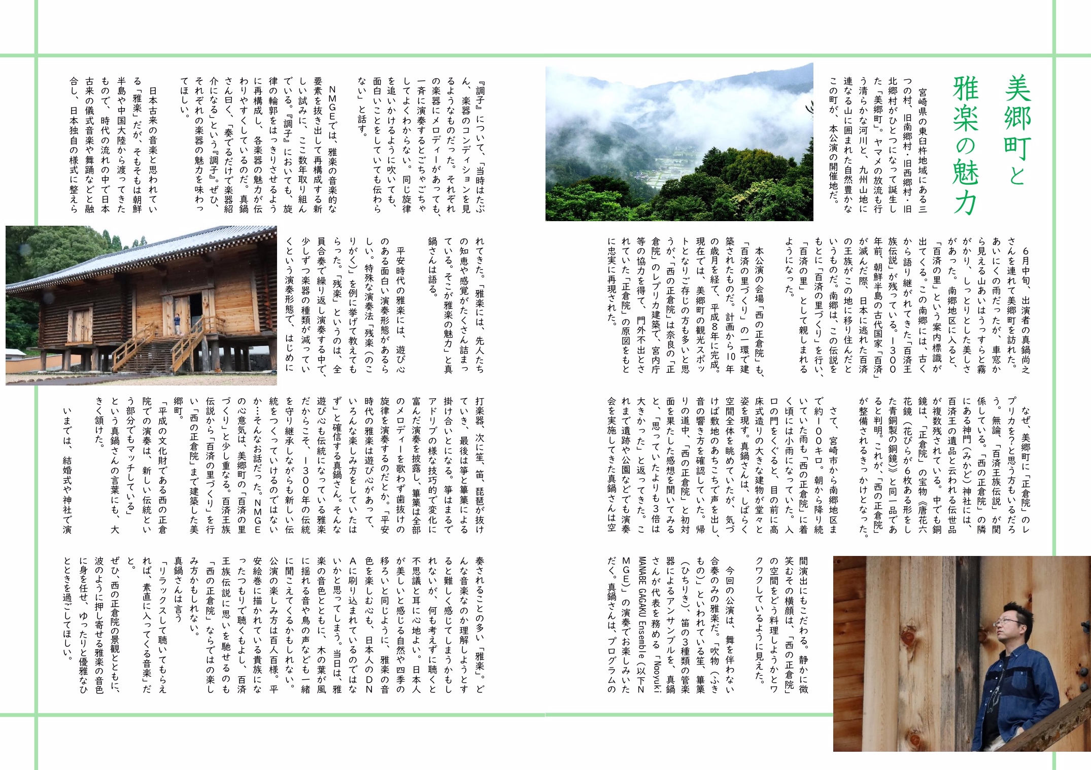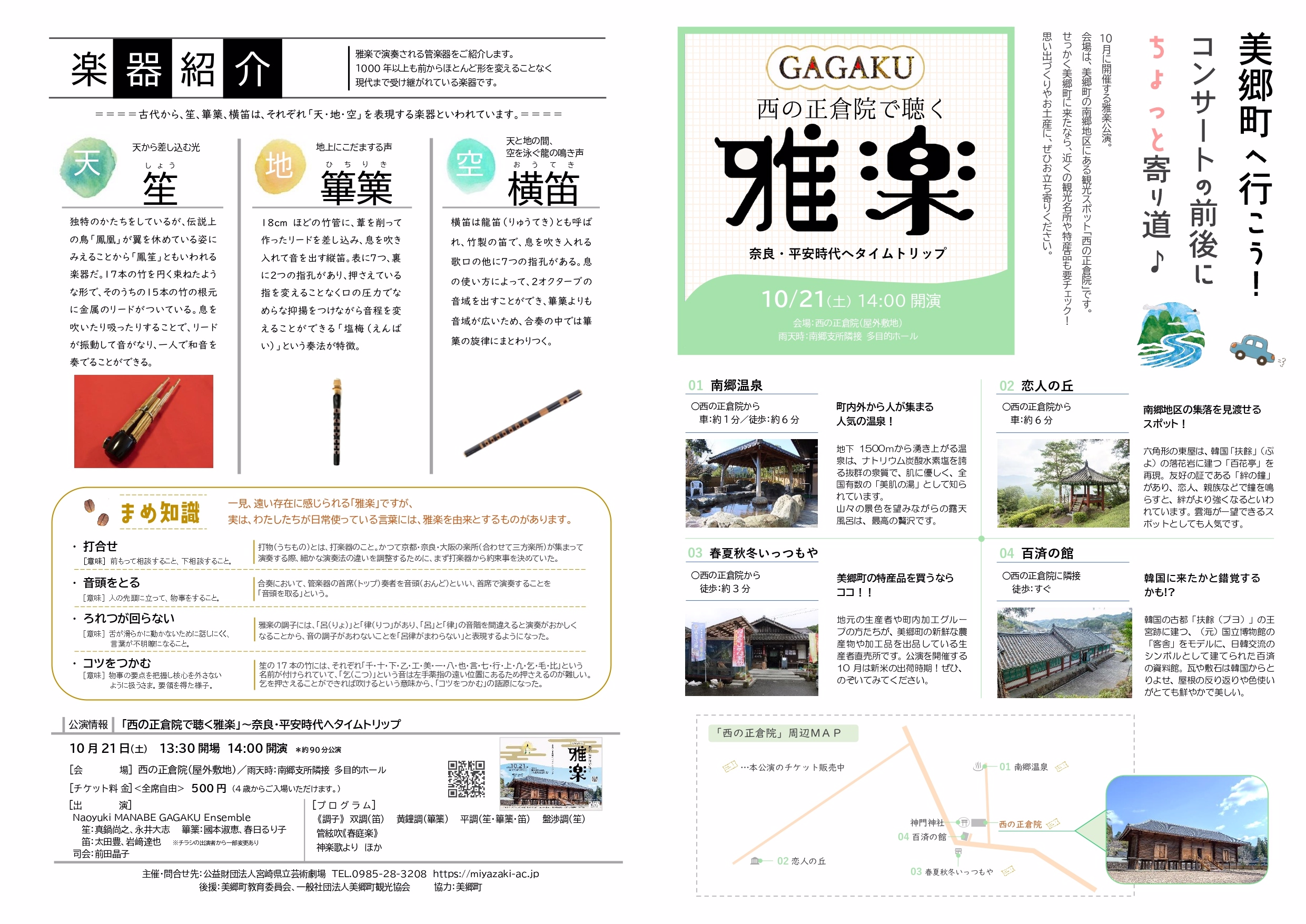 今回は、美郷町の観光スポット「西の正倉院」の景観とともに、悠久の時の流れに思いを馳せながら、ゆったりと「雅楽」をお楽しみいただきます。