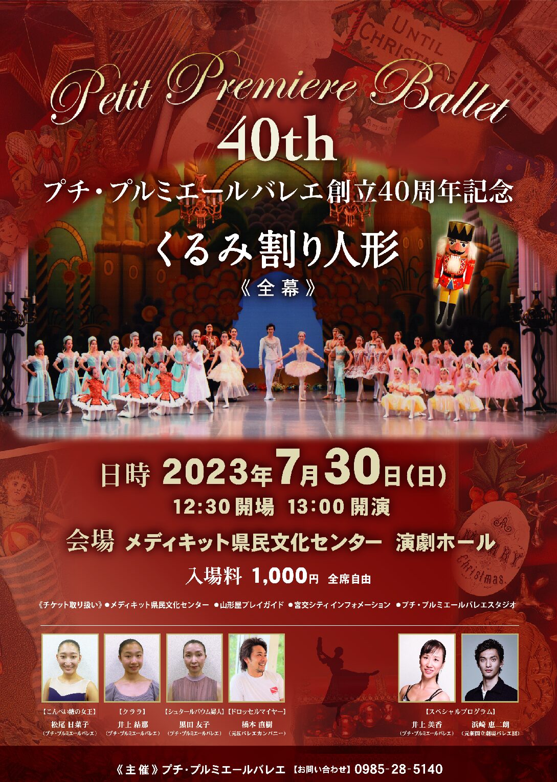 プチ・プルミエールバレエ 創立40年記念公演 「くるみ割り人形 (全幕) 」 演劇・ダンス チラシダウンロード 料金 お問い合わせ先 2023年07月30日(日) 演劇ホール 開場 12:30/開演 13:00/終演予定 15:30 駐車場の混雑が予想されます 料金 1,000円 * 未就学児もご入場いただけます。 お問い合わせ先 プチ・プルミエールバレエ 井上 0985-28-5140
