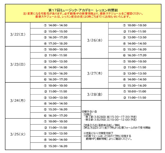 ■聴講 レッスン時間割及び受講曲などは、前日夜(20時ごろまで)に劇場HP【最新情報】で発表するほか、当日の聴講受付で配布します。