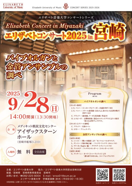 エリザベトコンサート 2025 in宮崎 音楽 チラシダウンロード チケット料金 お問い合わせ先 2025年09月28日(日・祝) アイザックスターンホール 開場 13:30/開演 14:00/終演予定 15:40 駐車場の混雑が予想されます チケット料金 無料(未就学児入場不可) お問い合わせ先 エリザベト音楽大学 学事部演奏(赤木)※平日09:00~16:00 ホームページ https://www.eum.ac.jp/ メール enso01@eum.ac.jp 082-225-8004
