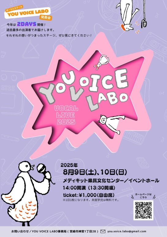 YOU VOICE LABO LIVE2025 音楽 入場料 お問い合わせ先 2025年08月10日(日) イベントホール 開場13:30/開演14:00/終演予定18:30 駐車場の混雑が予想されます 入場料 1,000円 ※当日券:13:00~ホール入口にて販売あり(1,000円) お問い合わせ先 YOU VOICE LABO事務局 MAIL:you.voice.labo@gmail.com HP:https://youvoicelabo.com