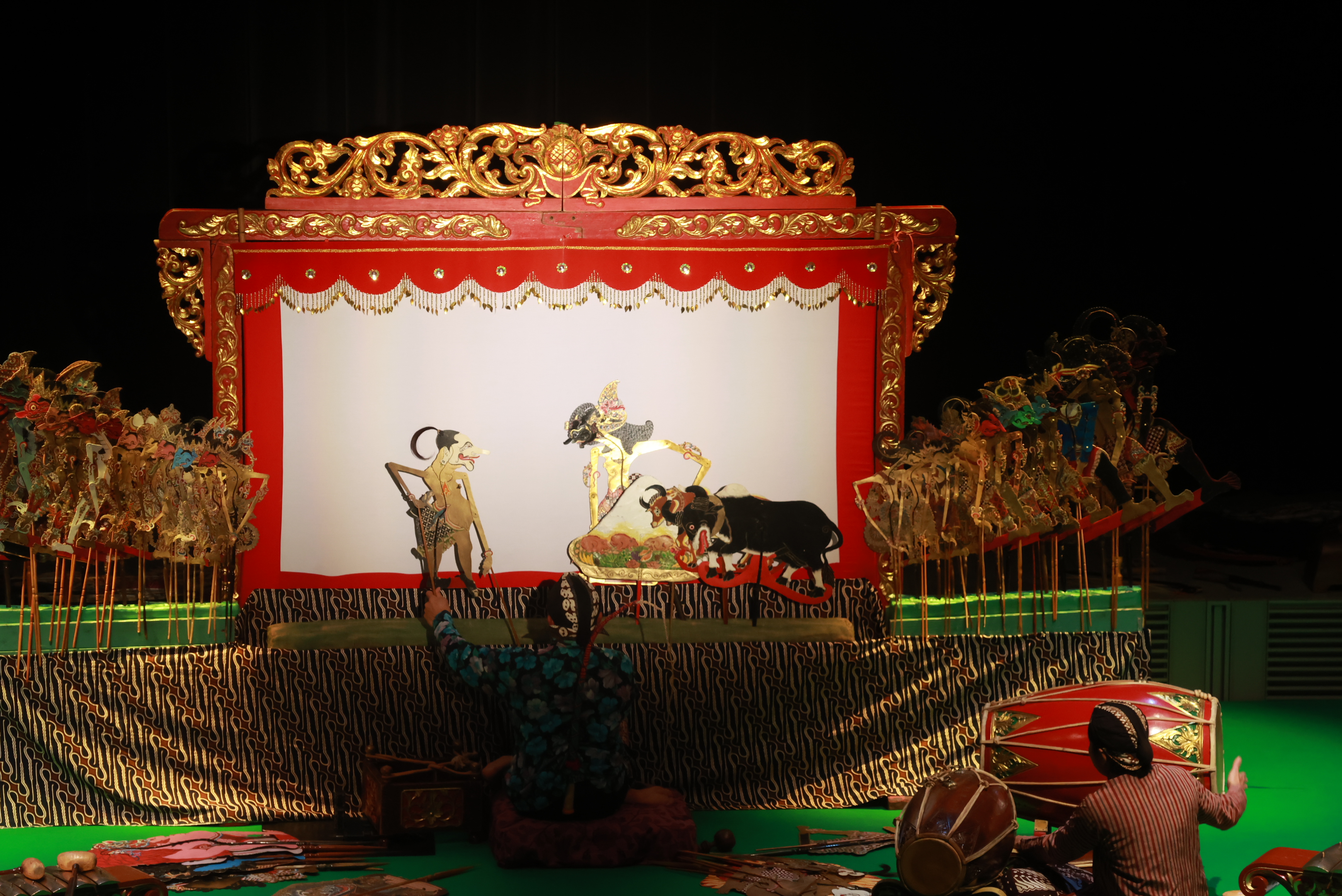 水牛の皮で作られた色鮮やかな人形ワヤン・クリを操り、スクリーンに影を映し出して演じられる物語のこと。影絵師1人で何体もの人形を操ります。