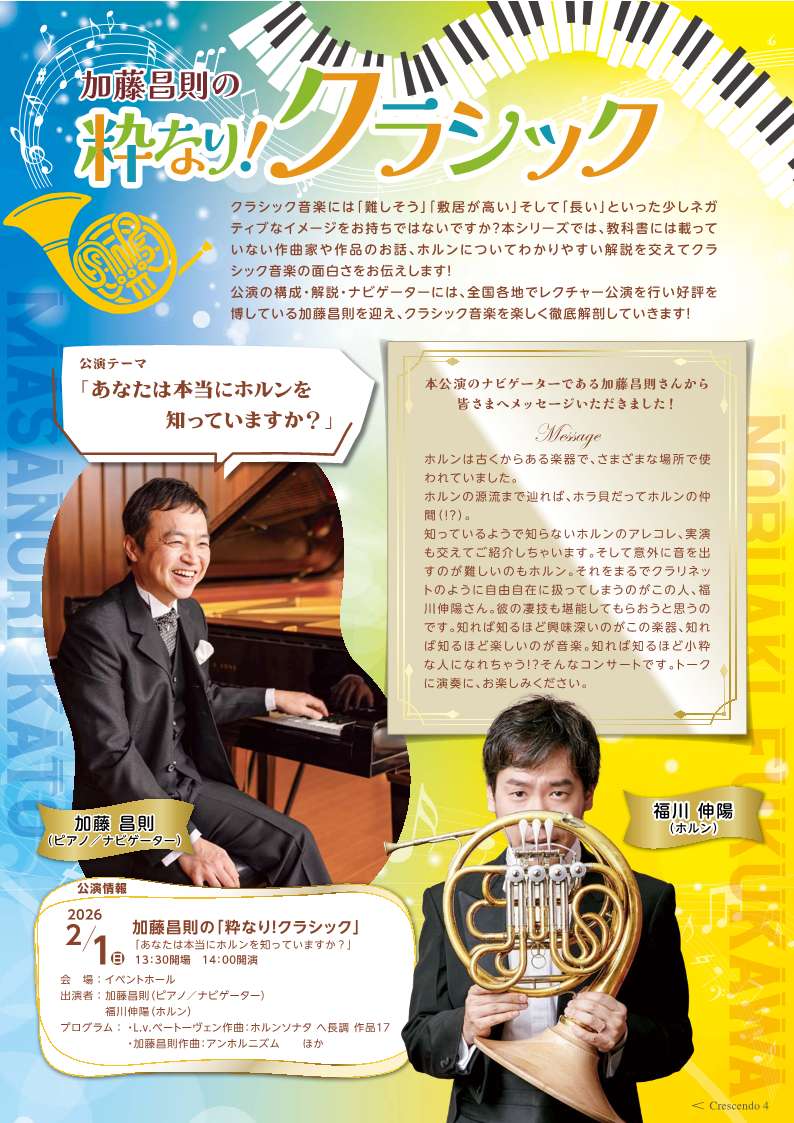 公演の構成・解説・ナビゲーターには、全国各地でレクチャー公演を行い好評を博している加藤昌則を迎え、クラシック音楽を楽しく徹底解剖していきます!
