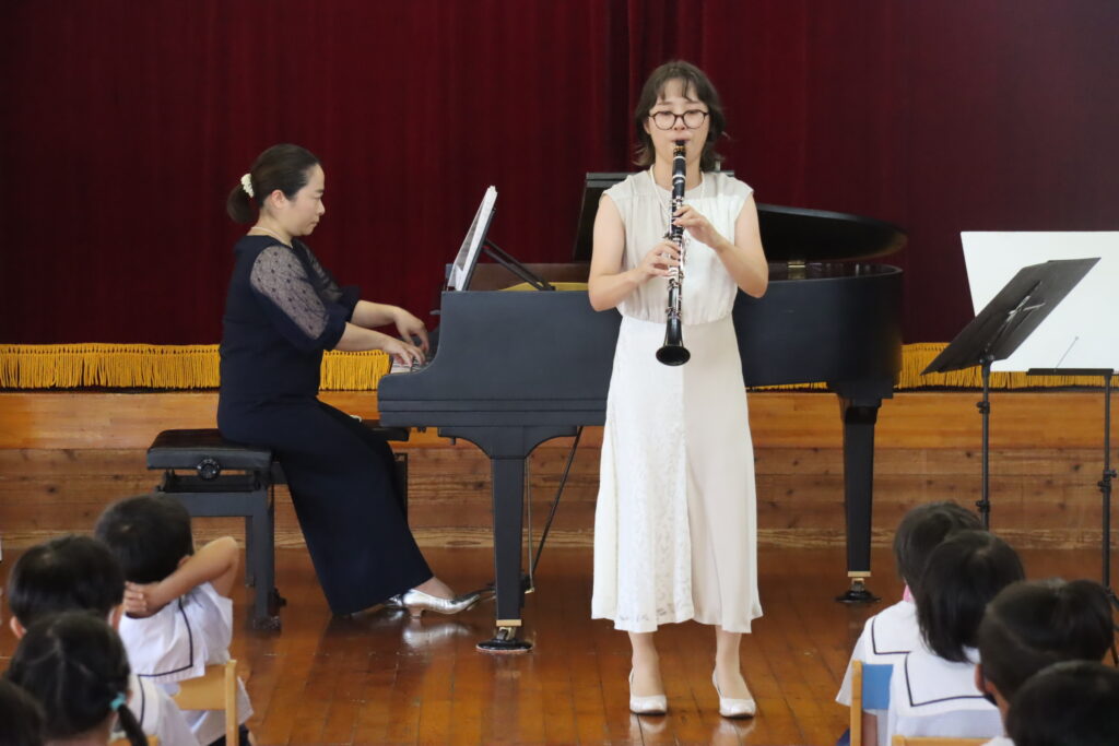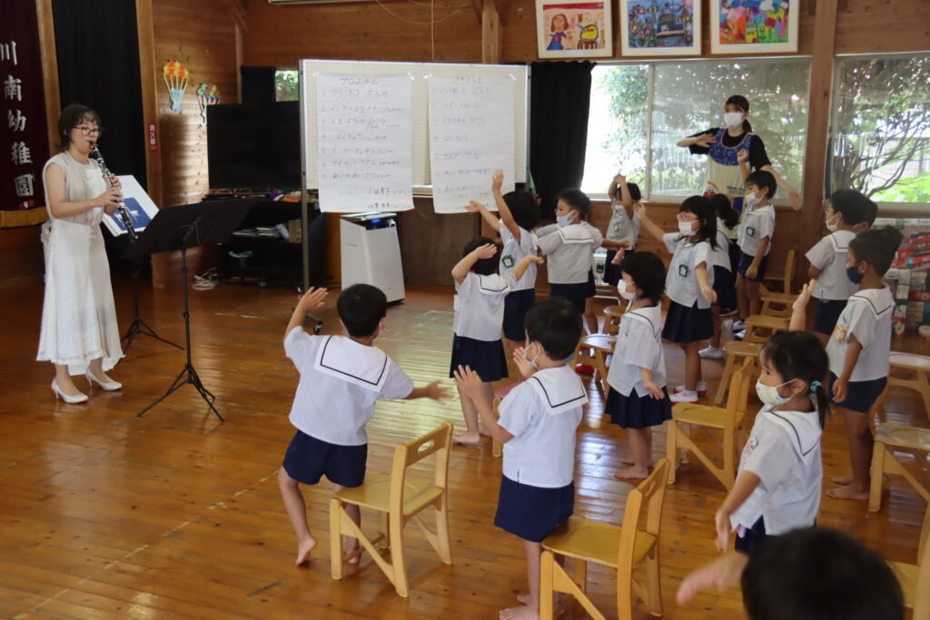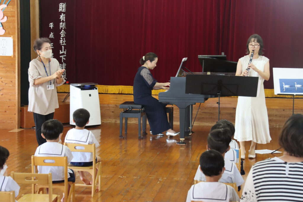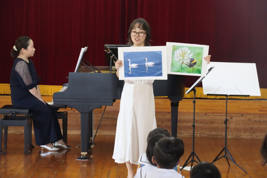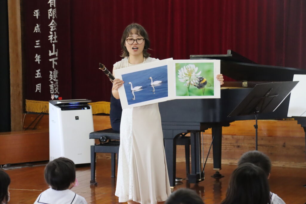目を閉じてクラリネットの音を聴いたり、クイズ形式で「蜂」(熊ん蜂の飛行)と「白鳥」の曲を聴いて当てるゲーム、そして手拍子で遊び、最後の「愛のあいさつ」(エルガー)の曲では、この曲にまつわる作曲家の話をして、みんなはどんな気持ちになるかなと問いかけて演奏しました。