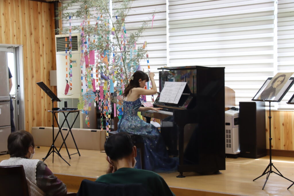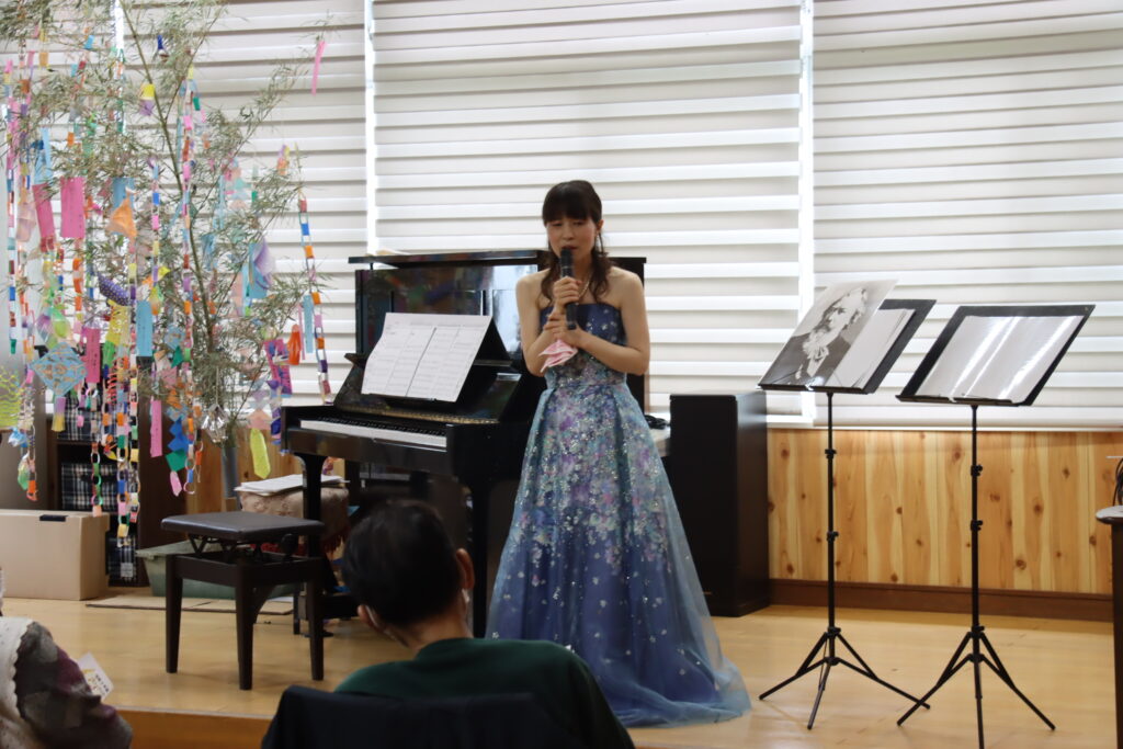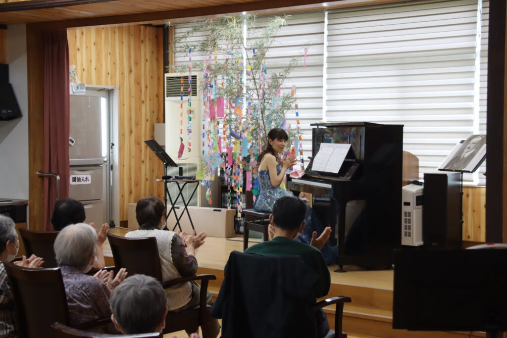 今回は三股町にある、アシステッド・リビングみまたさんへ演奏に伺いました♪ スタートはリクエスト曲より、坂本九さんの「上を向いて歩こう」を演奏させていただき、皆さま口ずさんでくださるなど、和やかにスタートしました。 続く楽器紹介の後に、ショパン作曲の2曲「ノクターン」と「子犬のワルツ」を演奏し、ゆったりした静かな音色と軽快な弾む音色をお楽しみいただき、続くシベリウスの「もみの木」では、北欧の情景や情感を楽しんでいただきました。 クラシック3曲の後は、耳のリフレッシュに…と、童謡メドレーを3曲(「たなばたさま」,「富士の山」,「海」)を演奏し、皆さま楽しく歌ってくださり、こちらの方が歌声に感動しました。 リフレッシュ後はクラシックに戻り、歌う曲として、ブラームスの「間奏曲」Op.118-2、プログラム最後は涼やかにイメージを楽しんでいただこうと「水の戯れ」を演奏し、終演後には音がきれいだったと言ってくださいました。 今回はゆったりとお楽しみいただけたらとご用意した曲ばかりですが、皆さまお話しも演奏も大変温かくも集中して拝見してくださいました。