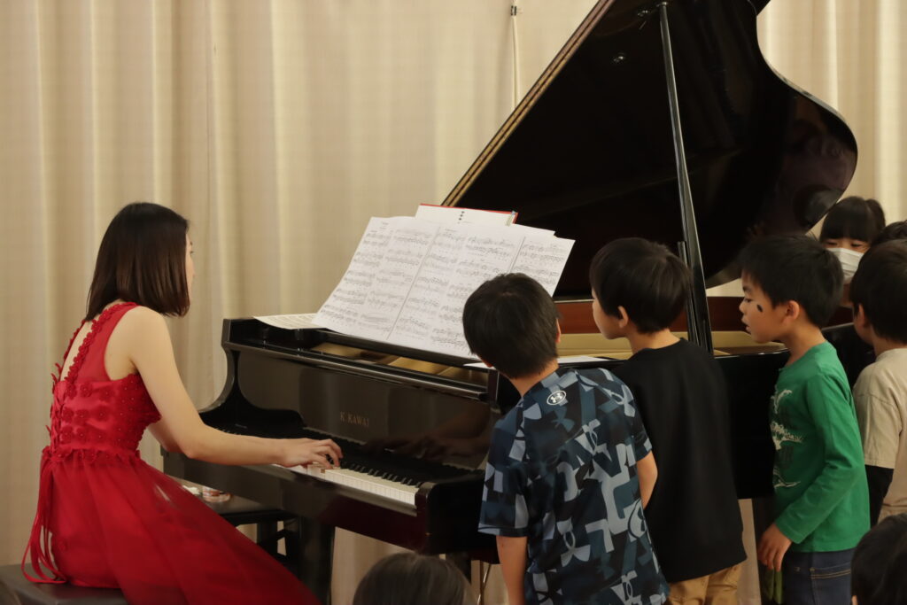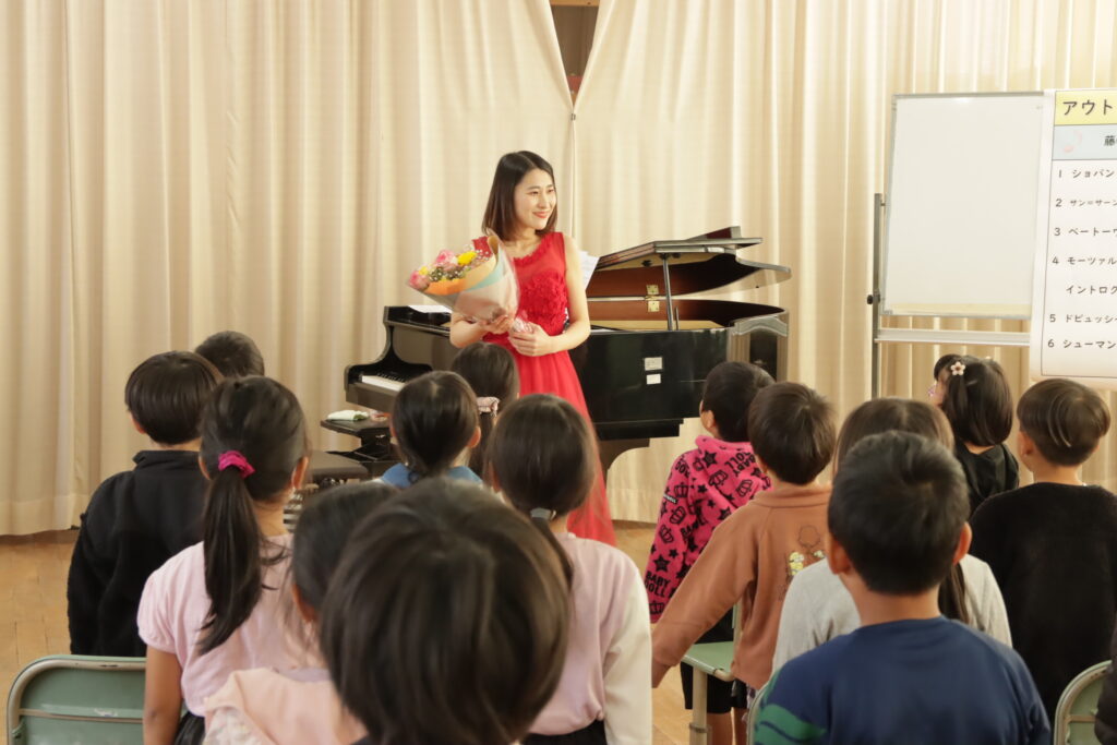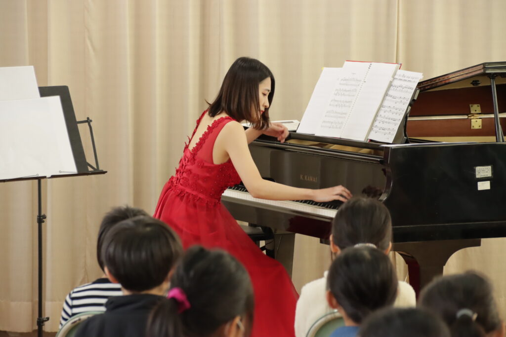 他にはベートーヴェン作曲の「エリーゼのために」、ドビュッシー作曲の「アラベスク第1番」、シューマン作曲の「飛翔」等を演奏させていただきましたが、集中して聴いてくださり、私もより楽しく演奏することができました。リズムで参加するモーツァルト作曲の「トルコ行進曲」や、イントロクイズは大変盛り上がりました。目をキラキラさせながら、最後まで全力で楽しんで公演に参加してくれた子供達の姿に私も元気をもらいました。