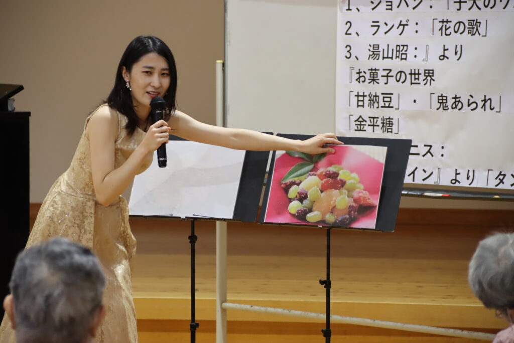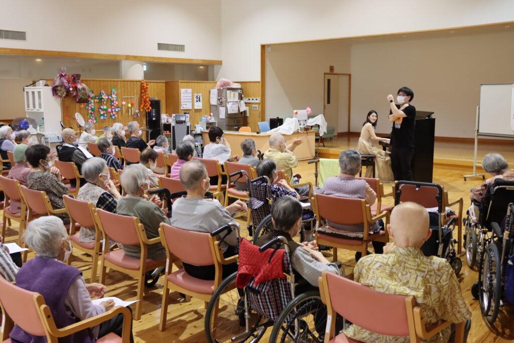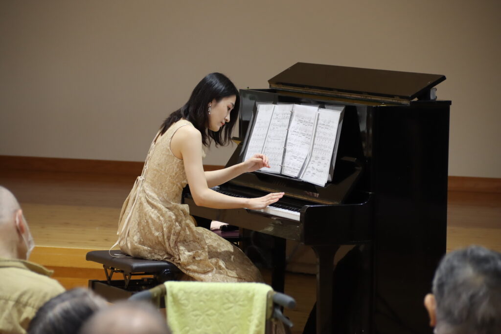 参加型の手遊びでリフレッシュしていただいた後は、「海」、「浜辺の歌」「夏の思い出」をメドレーで演奏しました。皆様がピアノに合わせて心を込めて歌ってくださる姿に大変感動しました。