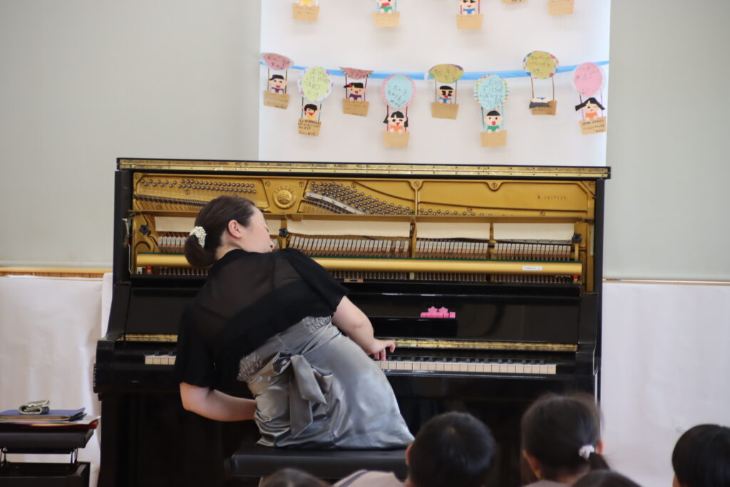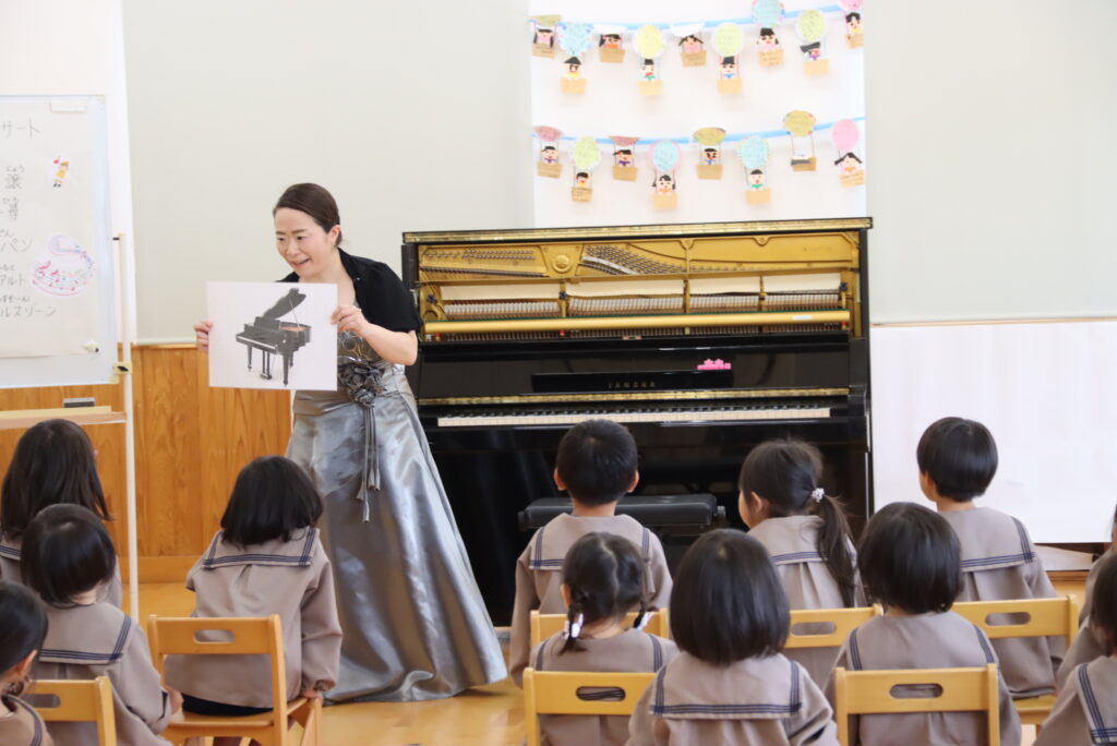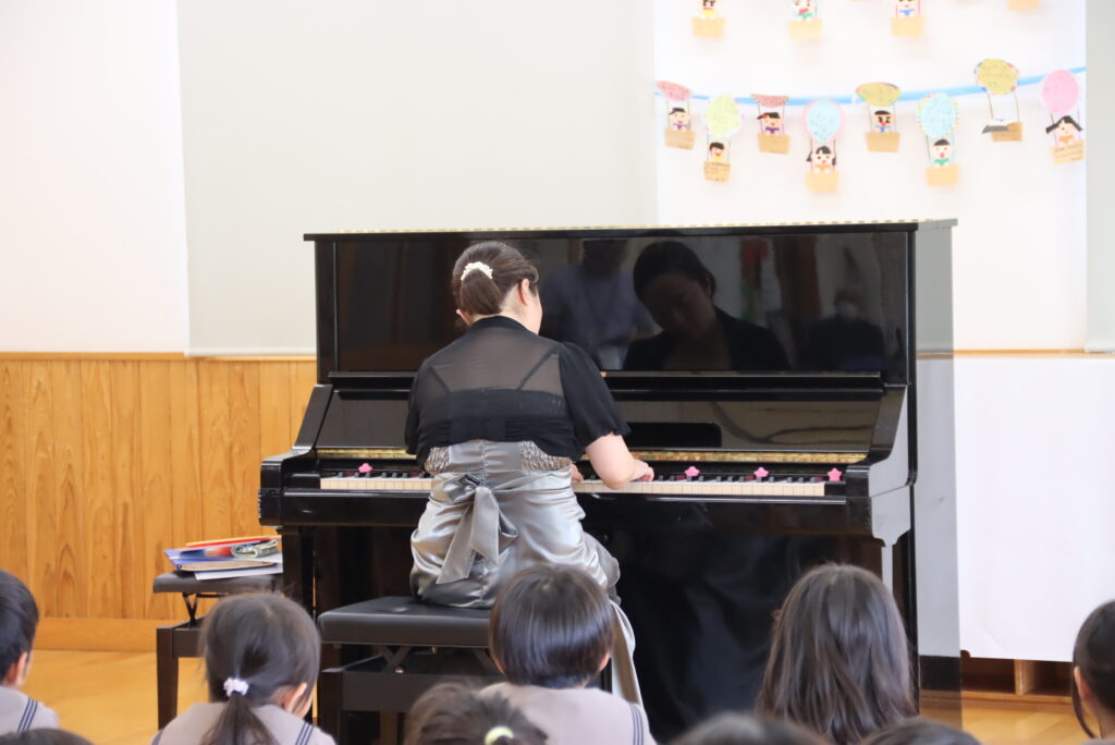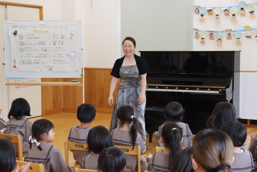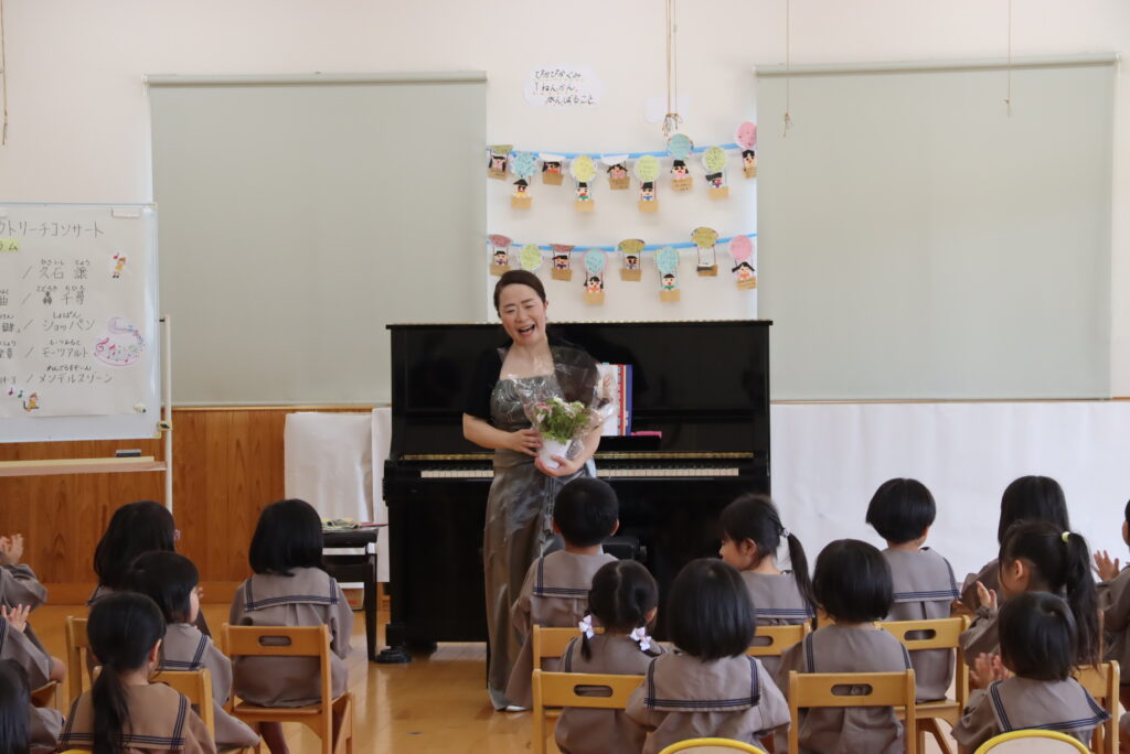 モーツァルトやメンデルスゾーンの作品を演奏した後、アンコールでは私の伴奏で「にじ」を一緒に歌いました。すると、なんとびっくり!先生方が美しいハーモニーで合唱してくださったのです。演奏しながら思わず振り返ってしまいました。園児の皆さんと先生方の素晴らしい歌声とともにピアノを演奏することができて大変幸せなひと時となりました。