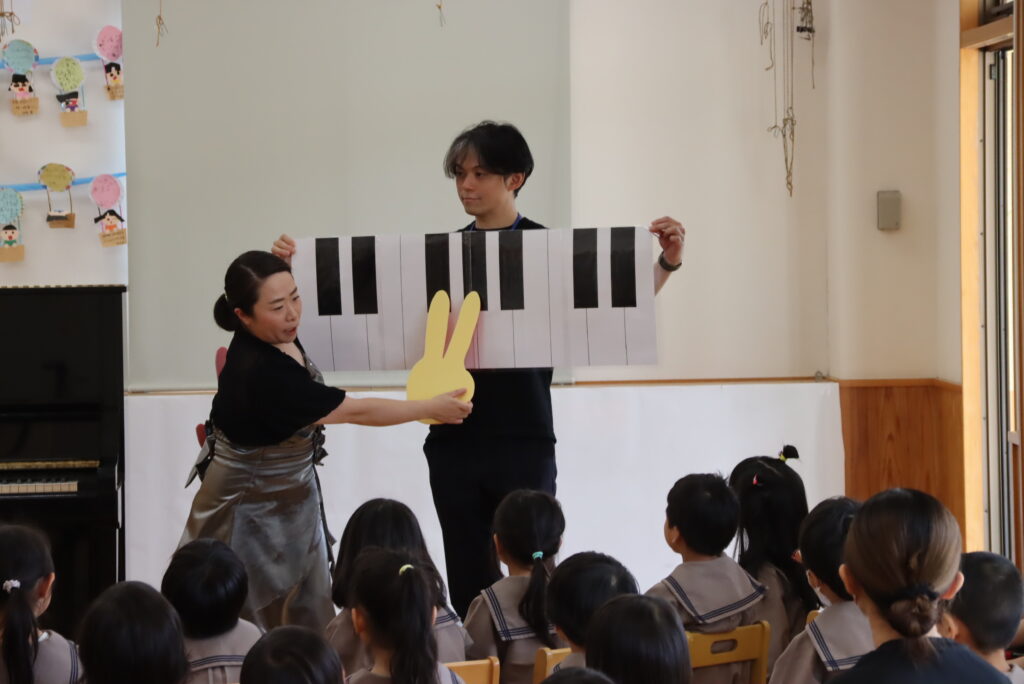 ピアノについて解説したり、ハンマーなどの部品の動きを見ながらショパンの作品を聴いていただいたあとは、88個ある鍵盤の中から「ド」の鍵盤を見つけるアクティビティをしました。綾保育園では、普段から鍵盤ハーモニカに取り組んでいるそうです。これをきっかけに音楽を自分で演奏することにさらに興味をもってくれるといいなあと思いました。