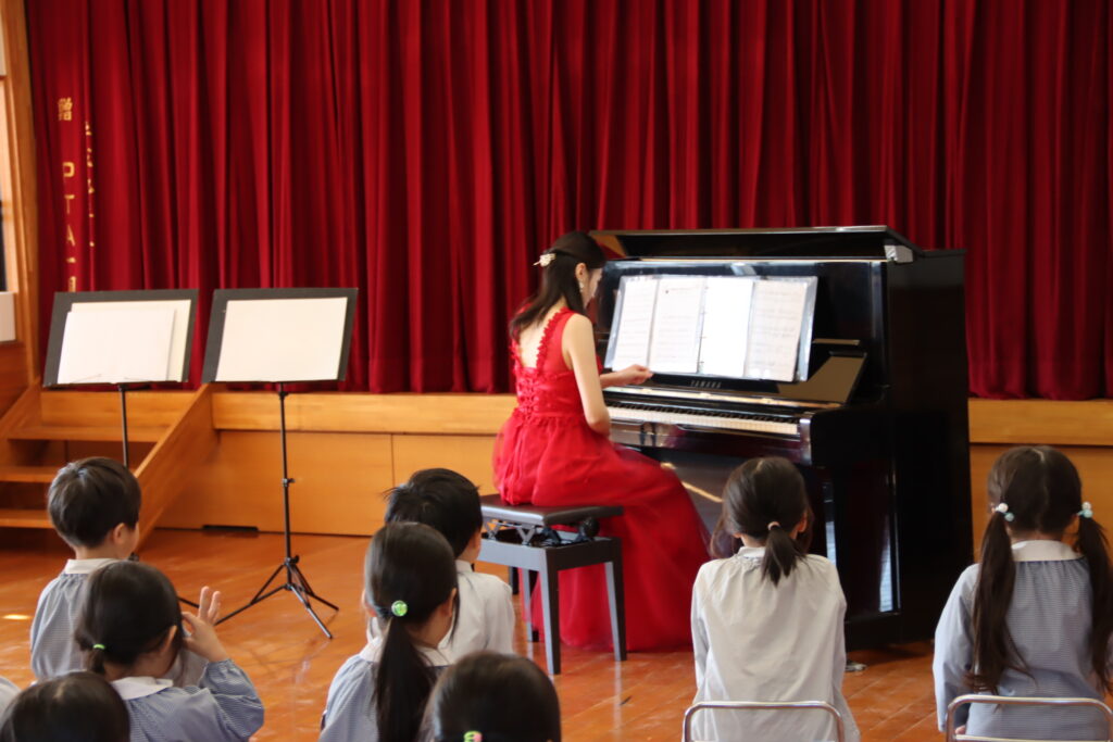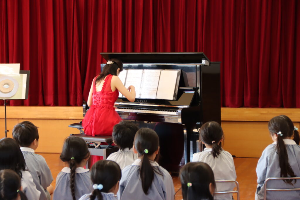 挨拶の次は、湯山昭作曲の《お菓子の世界》より「バウムクーヘン」「金平糖」を演奏しました。演奏する前に園児さん達に好きなお菓子を尋ねると、聞き取れないほど元気な声でそれぞれの好きなお菓子を答えてくださいました。私の問いかけに毎回元気よく笑顔で答えてくださる園児さん達の姿に、私までたくさん元気をもらいました。楽器紹介の後には、アップライトピアノの上前板を外してハンマーが見える状態のまま、ショパン作曲の「小犬のワルツ」を演奏しました。