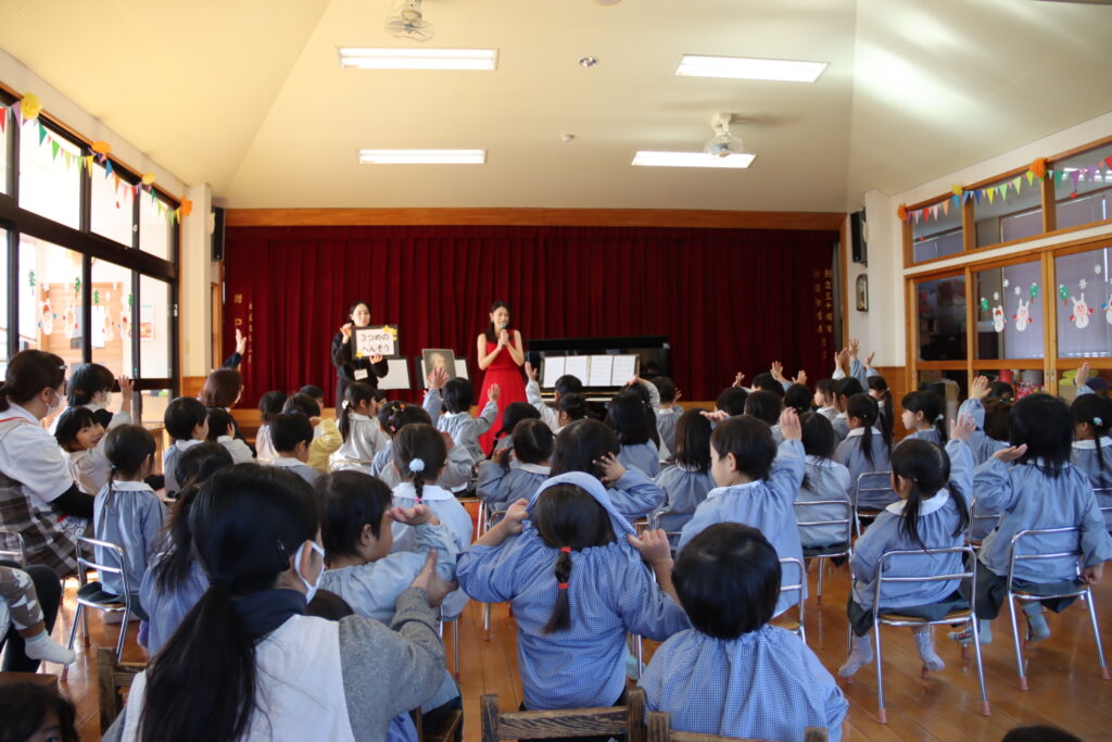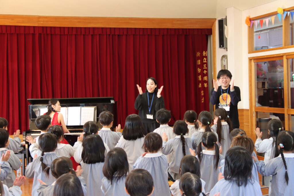 初めて見るハンマーの動きに目をキラキラさせながら興味津々な様子で聴いてくださいました。アンコールでは、園児さん達がマーチングで演奏したディズニーの「右から2番目の星」と「リメンバー•ミー」をメドレーで演奏し、公演を終えました。