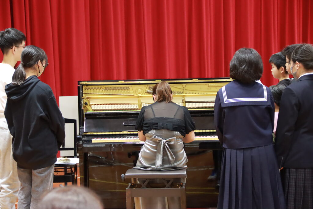 生徒の皆さんにとって親しみのある曲から始めたいと思い、「瑠璃色の地球」からプログラムはスタート。合唱した時のことを思い浮かべながら聴いてくれた様子でしたので、「音楽は一瞬でその時の記憶を呼び覚ましてくれますね。今日は心をたくさん動かして音楽を楽しんでください。」と伝えてコンサートを始めました。