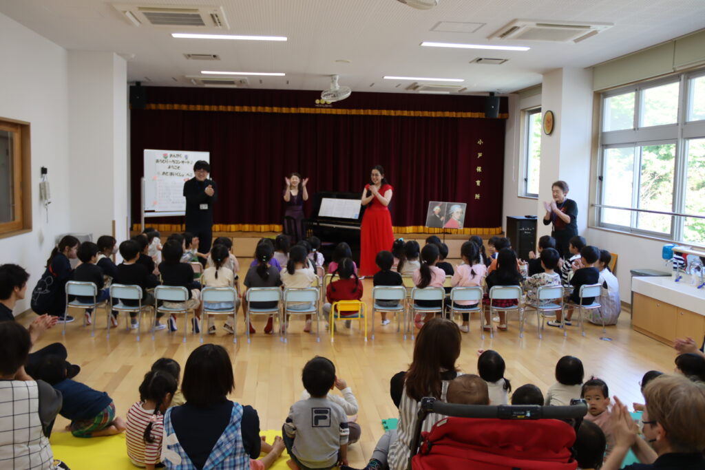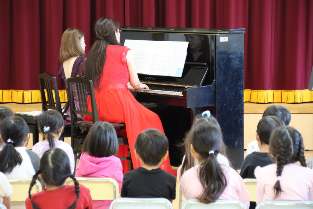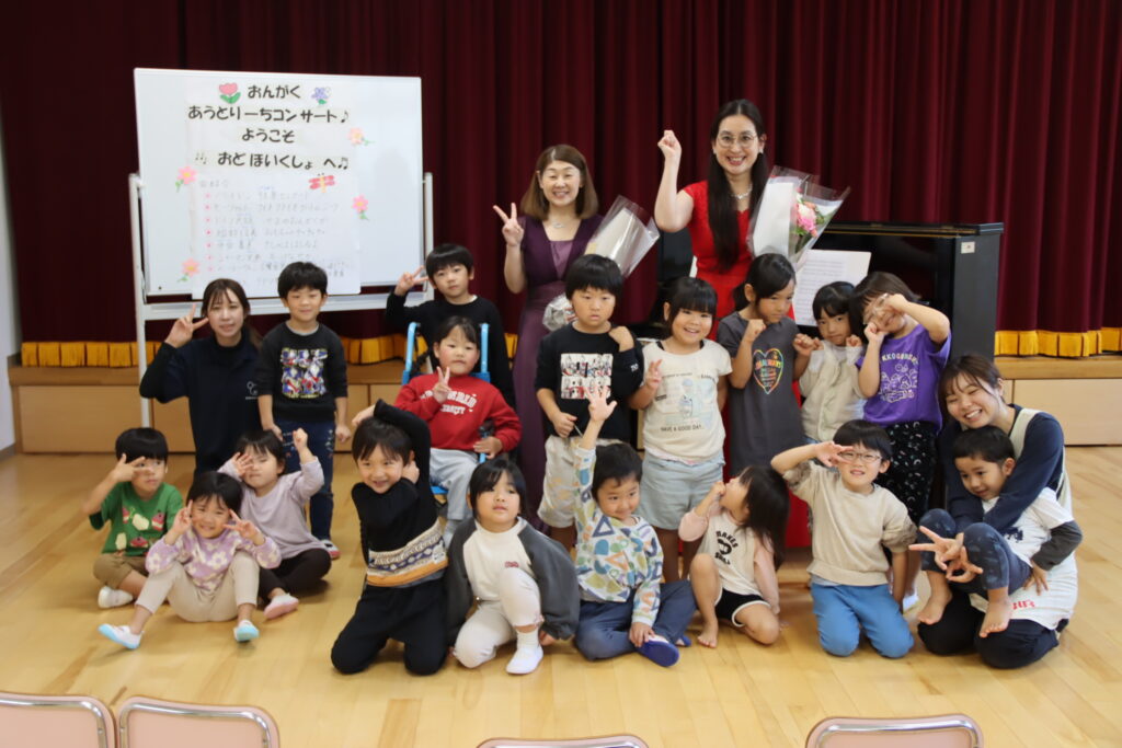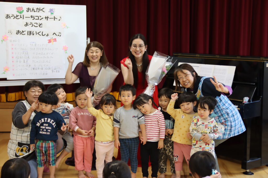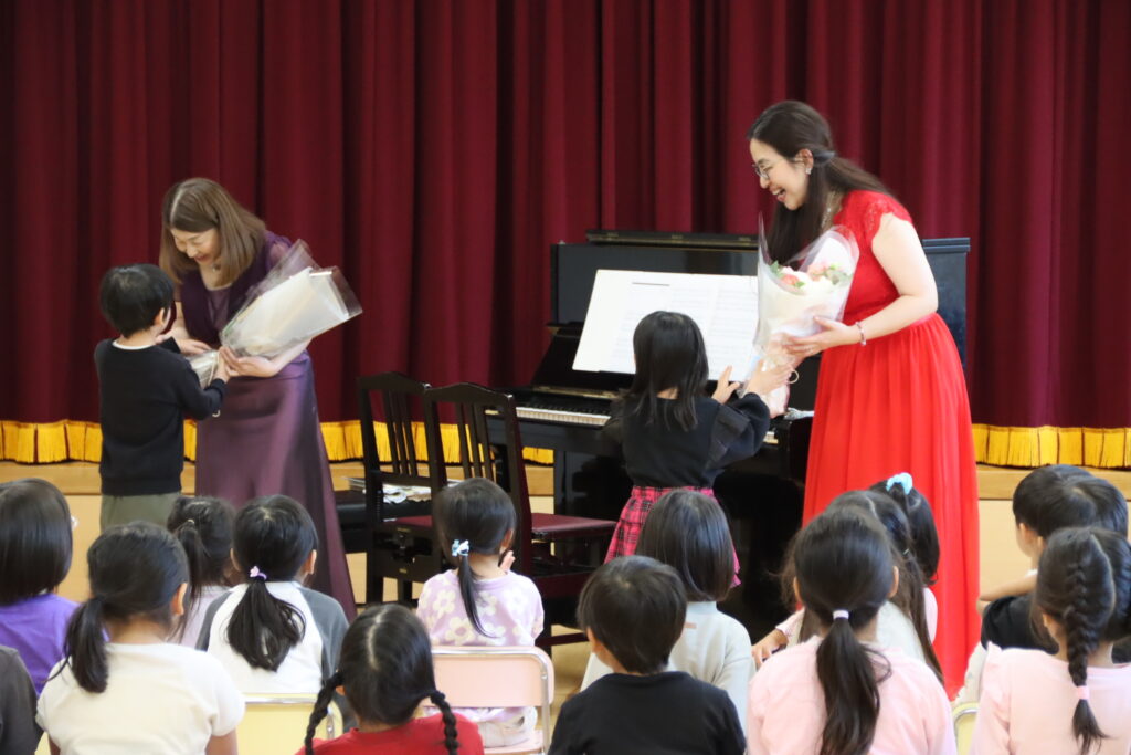 園児の皆さんが普段歌っている曲や、発表会に向けて練習している曲を中心に演奏したため、ピアノ連弾に合わせて一緒に歌ったり、手拍子をしてくれたりと、会場は終始あたたかな雰囲気に包まれました。