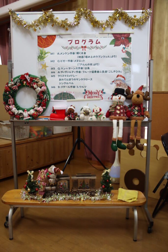 クリスマス曲のご依頼があり、「あわてんぼうのサンタクロース」と「ジングルベル」の2曲をメドレー形式で演奏しました。サンタやトナカイの装飾を身につけ、鈴の音も入って、一足早いクリスマスコンサートとなりました。