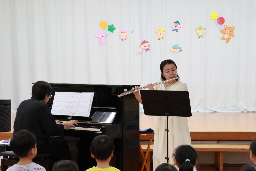 はじめにディズニー映画「アラジン」より「ホールニューワールド」を演奏しました。初めてフルートを目にする園児たちも多く、集中して聴いている子どもたちの表情が印象的でした。2曲目にフルートの優しい音色がよく伝わる、シュテックメスト作曲の「歌の翼による幻想曲」を演奏し、楽器紹介をしました。音が鳴る仕組みをビンを使って説明し、園児1名にやってもらったところ、見事音が鳴って盛り上がり、コンサートの空気が柔らかくなったのを感じました。その後リムスキー=コルサコフ作曲の「熊蜂の飛行」を演奏し、これまでの2曲とは異なる曲調に園児たちは驚き、とても好評でした。