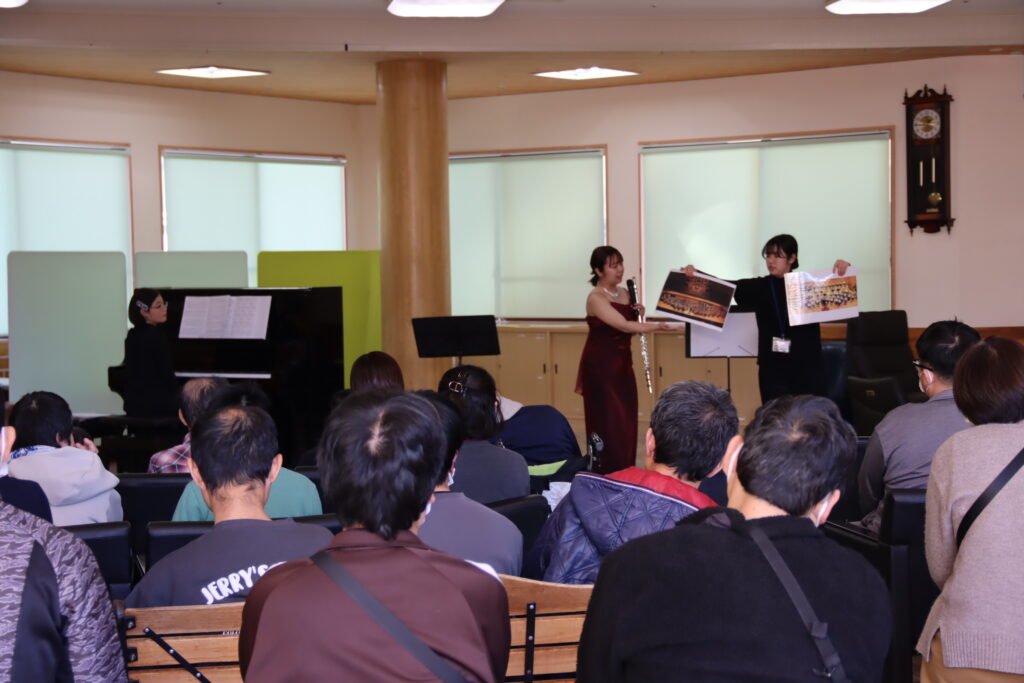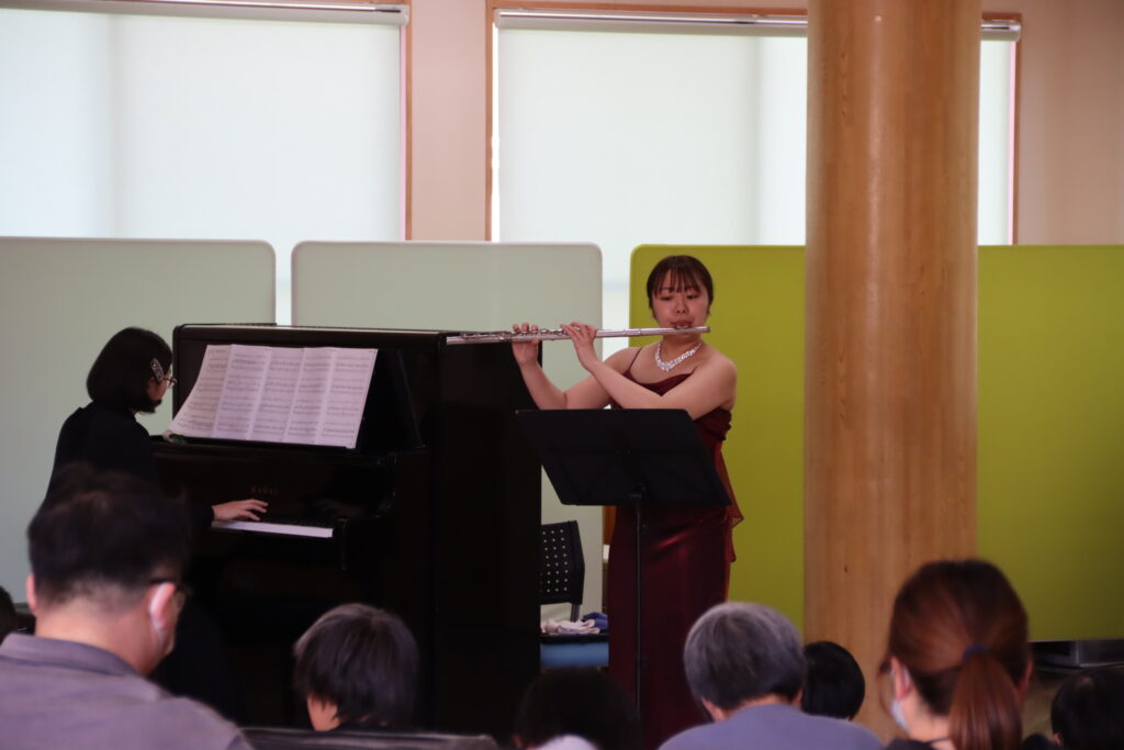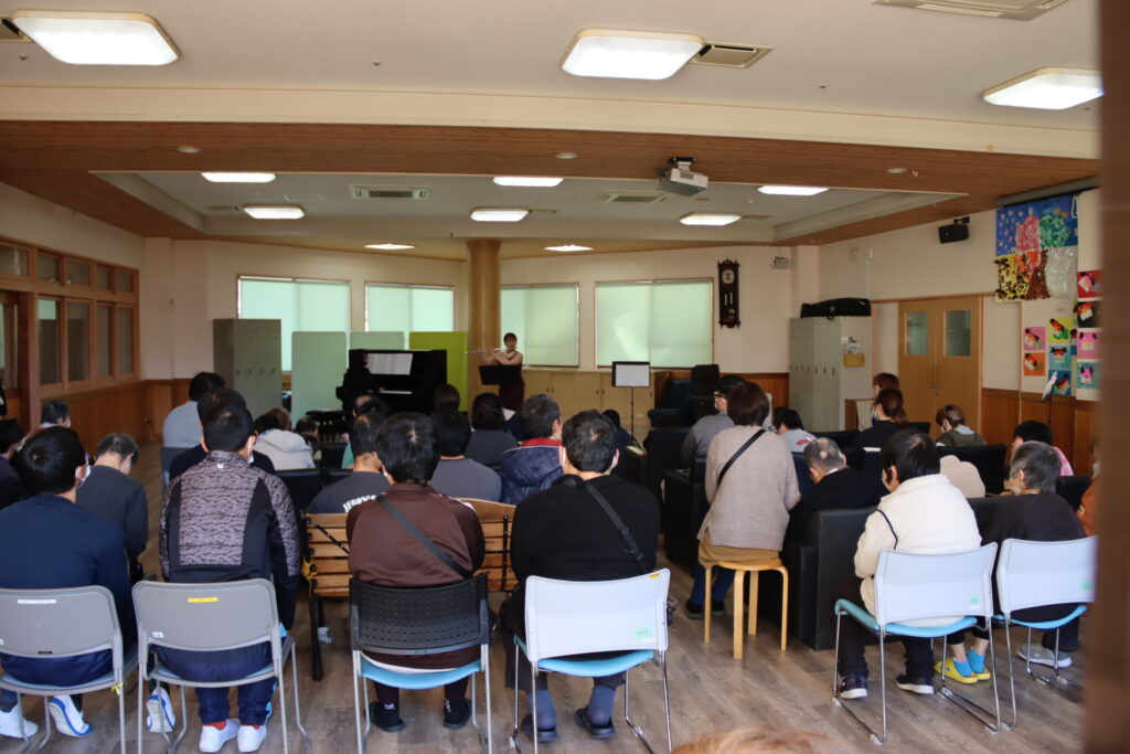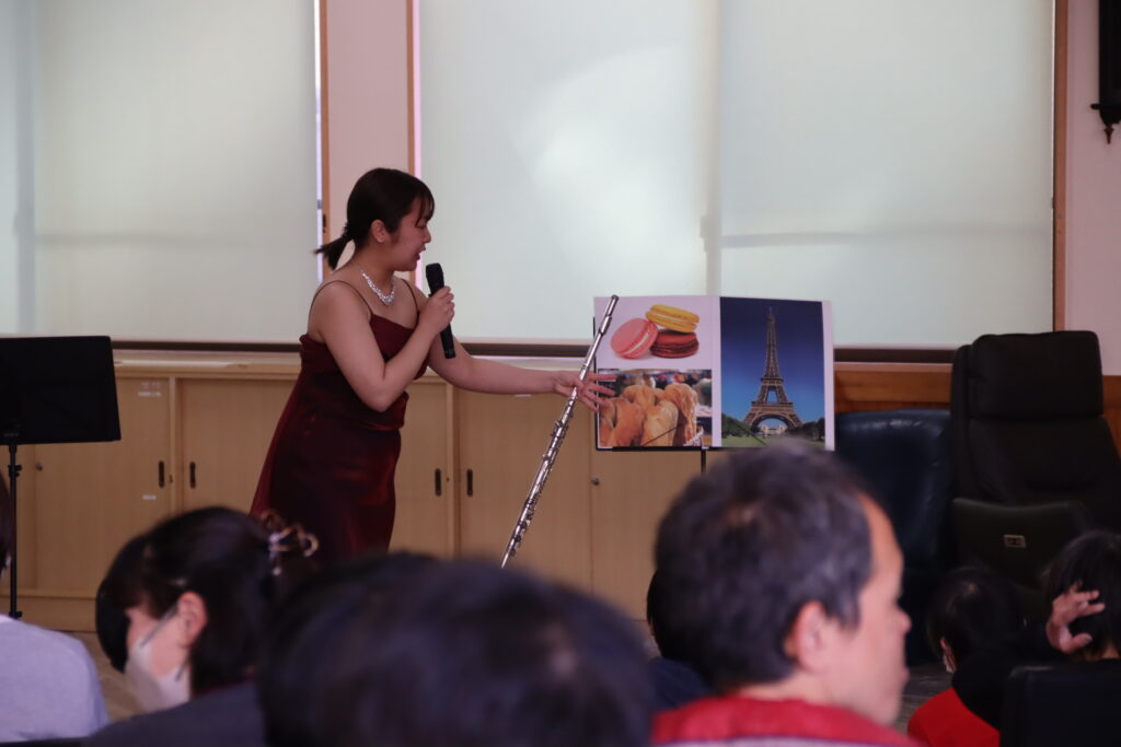 心躍るようなコンサートの始まりにしたいと思い、ジブリの「魔女の宅急便メドレー」で幕を開けました。2曲目はフルートの名曲、アルルの女より「メヌエット」を演奏しました。間近でフルートを見たり聞いたりすることが初めてだという方がほとんどで、とても集中して聴いてくださいました。今回はヨーロッパの旅をテーマにし、続いてフランスの作曲家フォーレの「ファンタジー」、ドイツの作曲家バッハの「ポロネーズ」、「バディネリ」、ハンガリー酒場をイメージしたモンティ作曲の「チャルダッシュ」を演奏しました。最後に里の皆様がよく聴いたり歌ったりするという美空ひばりさんの「川の流れのように」、アンコールに中島みゆきさんの「糸」を演奏して終演しました。
